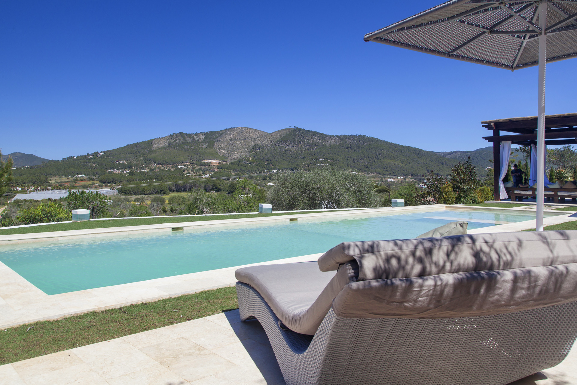 En el exterior, la villa cuenta con una piscina, zona de solárium y varias terrazas con espacios chill-out. Junto a la piscina, hay un comedor exterior bajo una pérgola desde donde pueden apreciar vistas al valle.
