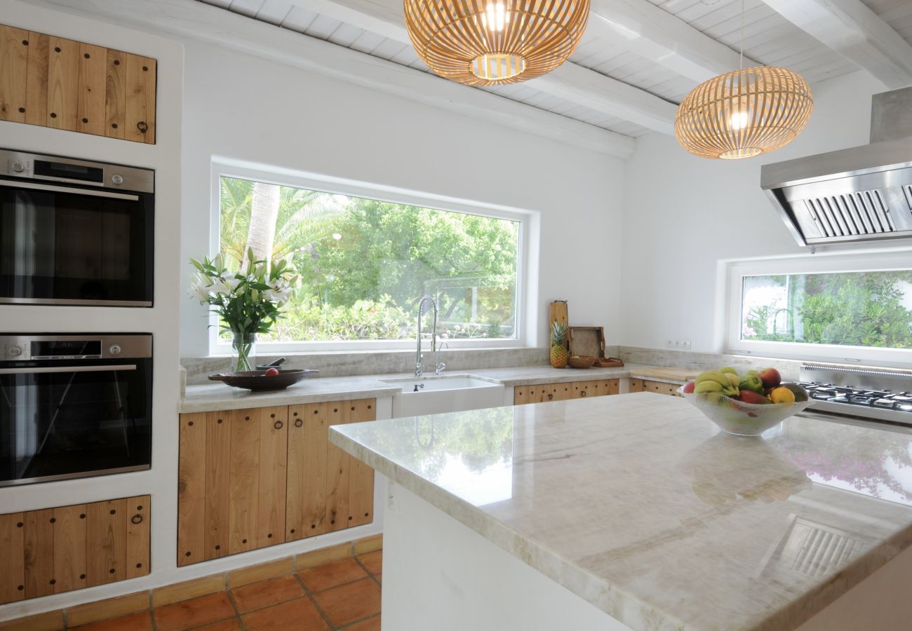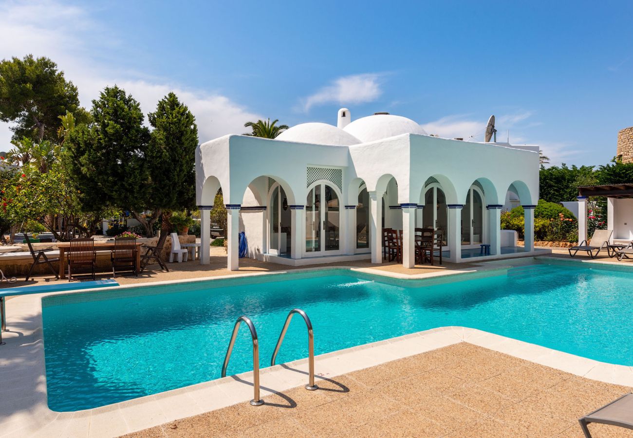 La arquitectura típica ibicenca se combina con elementos marroquíes, convirtiéndola en una propiedad verdaderamente encantadora. Cuenta con 8 dormitorios con baño en suite con ducha, distribuidas en: 5 dormitorios en la casa principal y 3 dormitorios en el anexo independiente. El anexo donde se encuentran tres de los dormitorios tiene cocina, TV y terraza exterior. Todos los dormitorios y salones disponen de aire acondicionado. La amplia zona exterior incluye varias terrazas en 2 niveles, una gran piscina con trampolín, barbacoa, estanque con peces y varias zonas chill-out para que los huéspedes puedan relajarse por completo. También hay una cama balinesa para protegerse del sol del mediodía o tomar una copa por la noche.