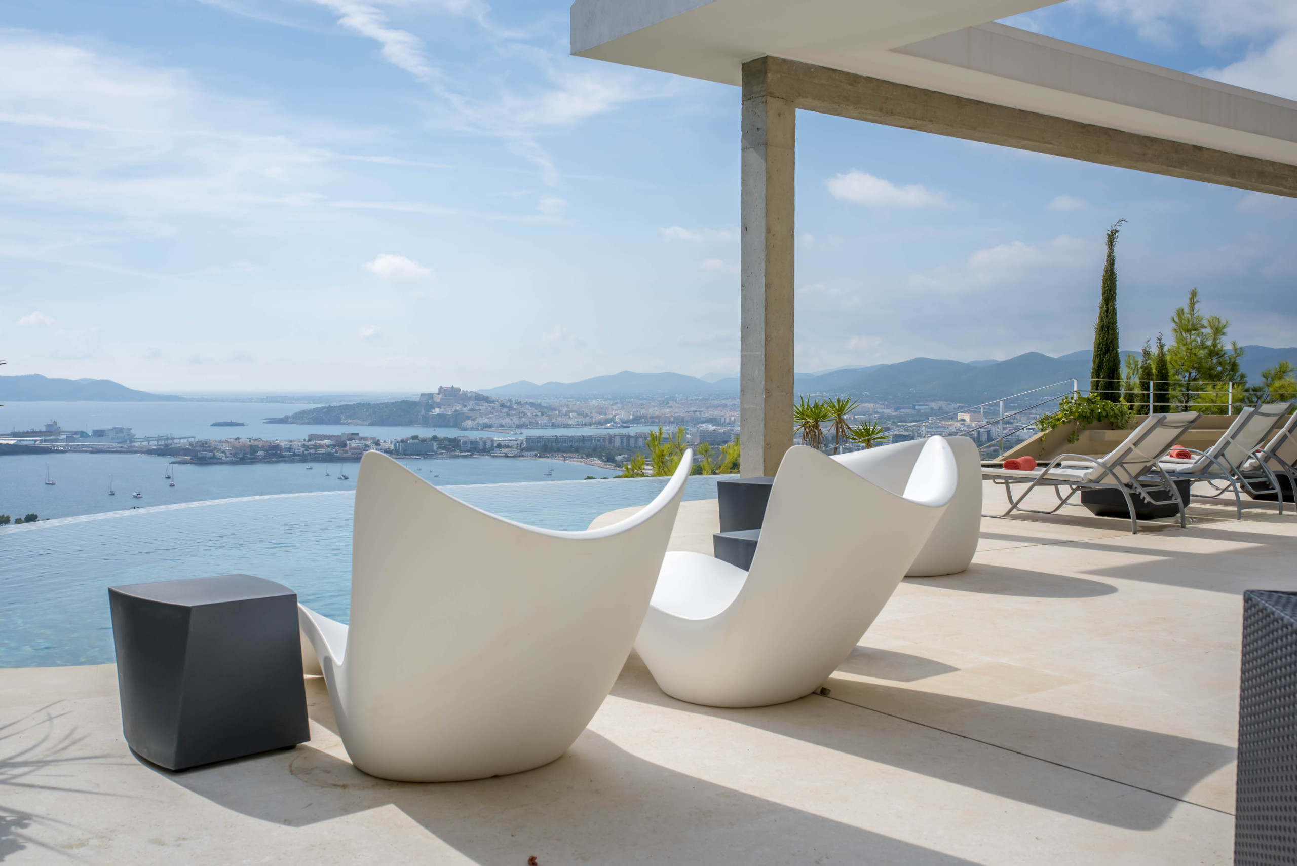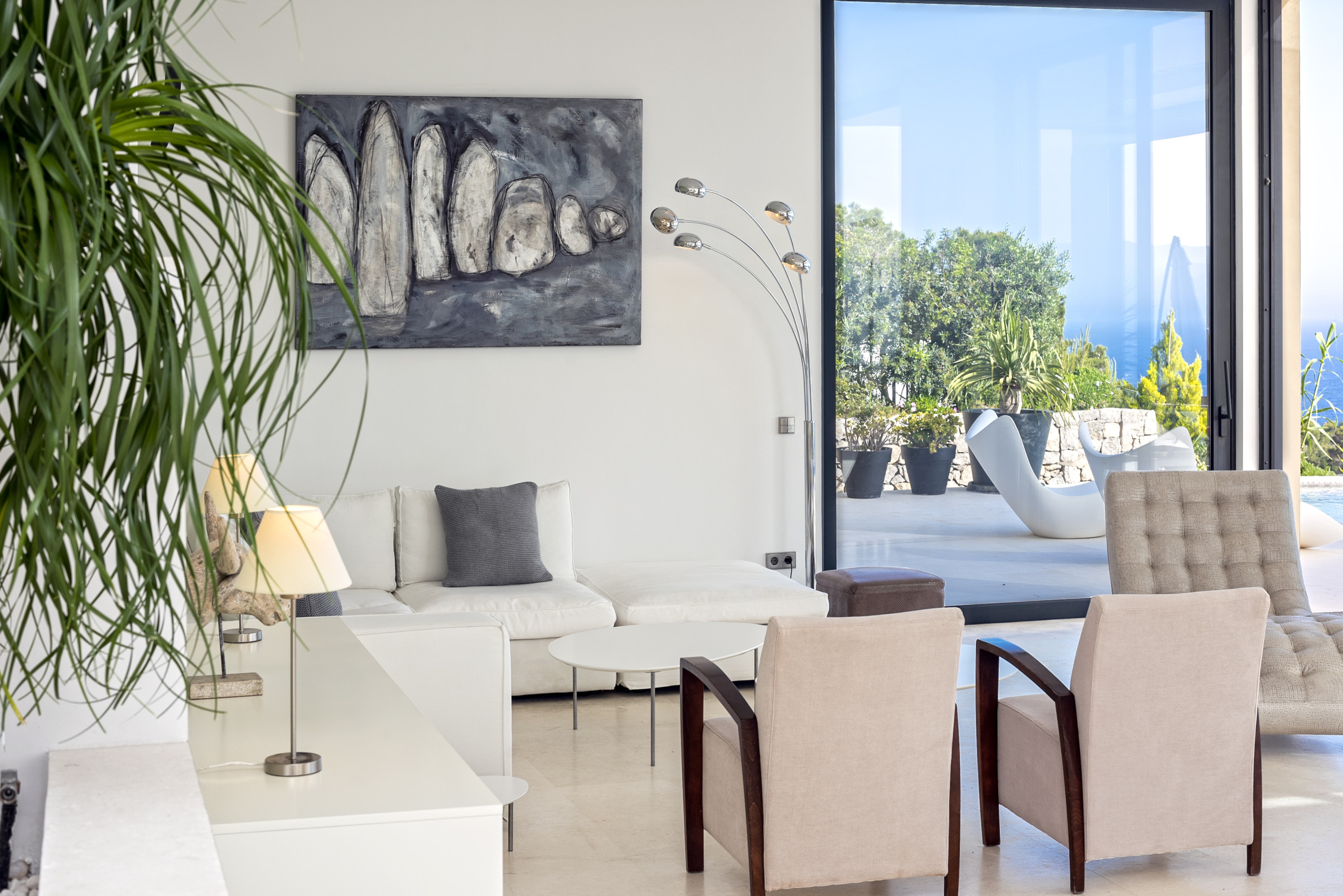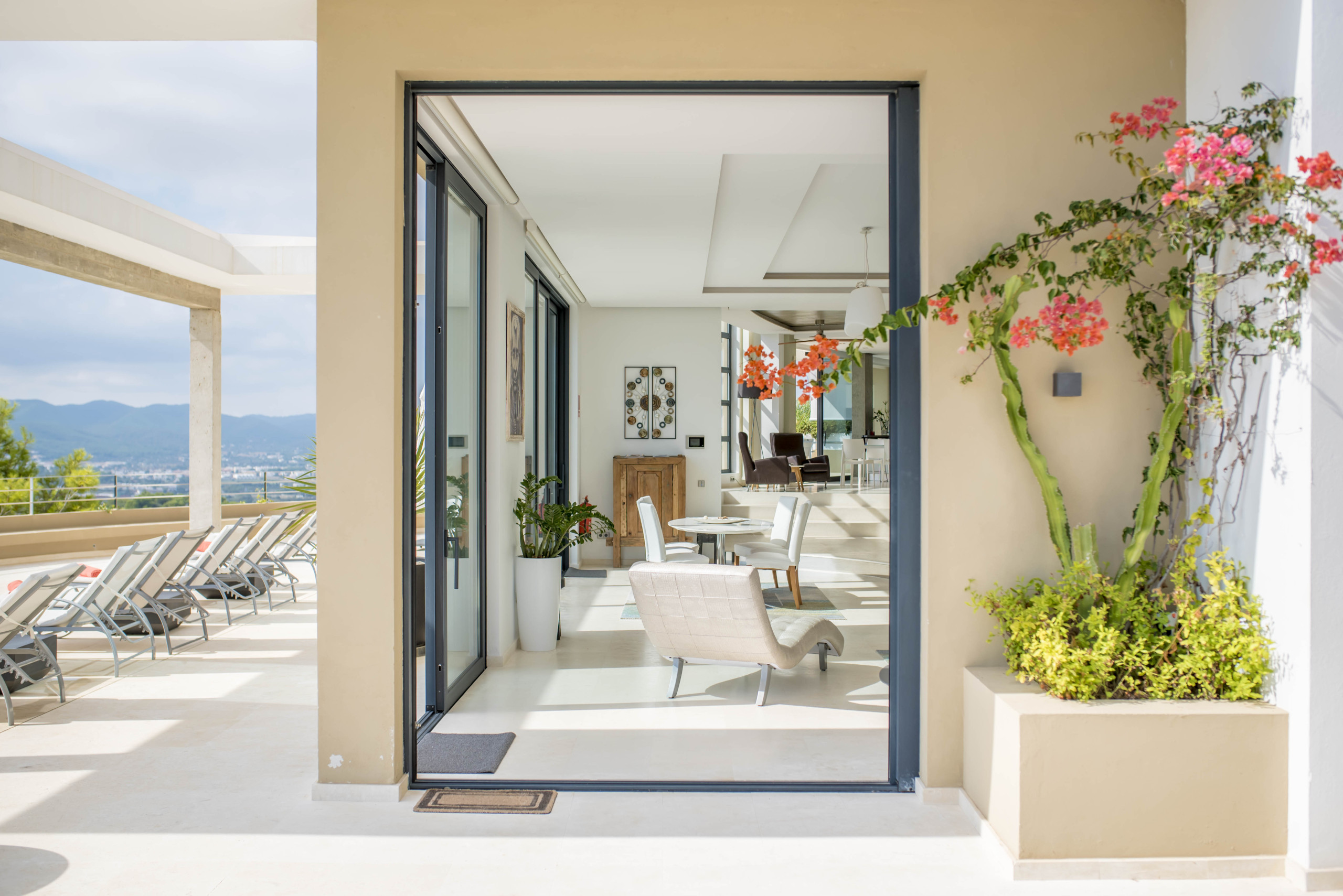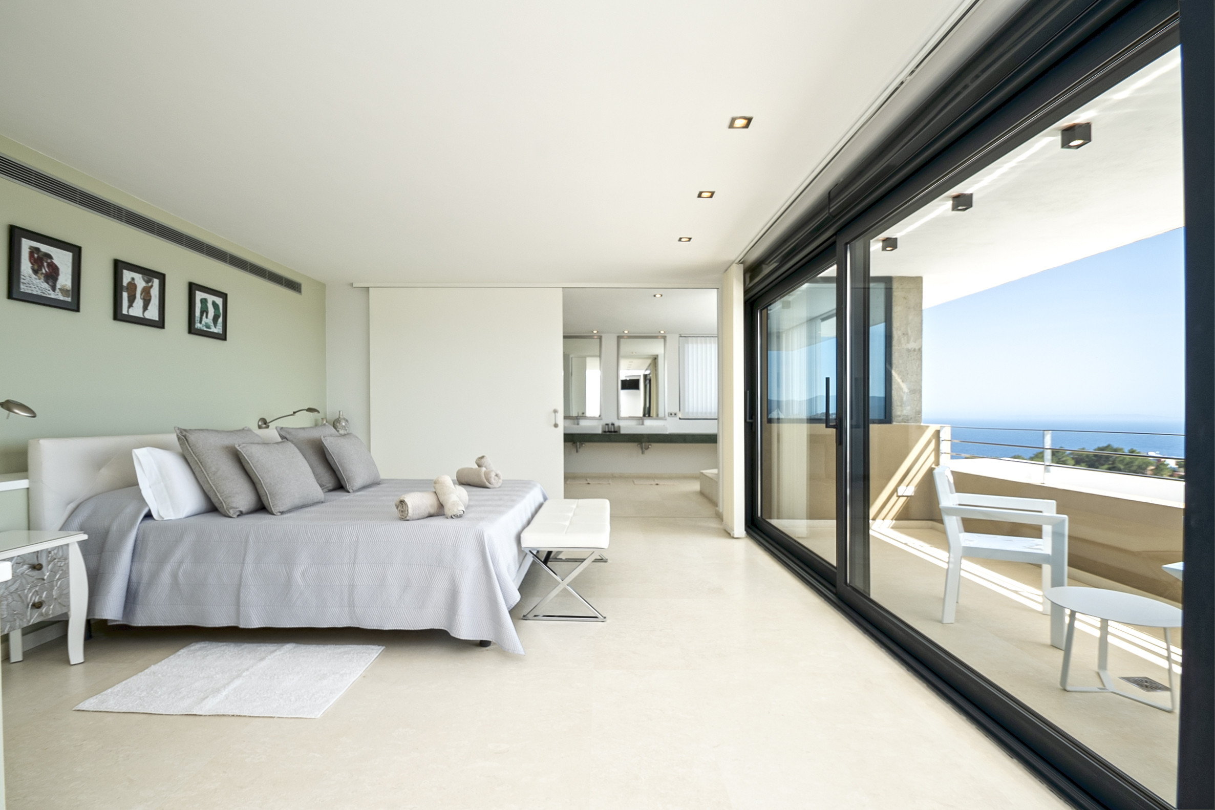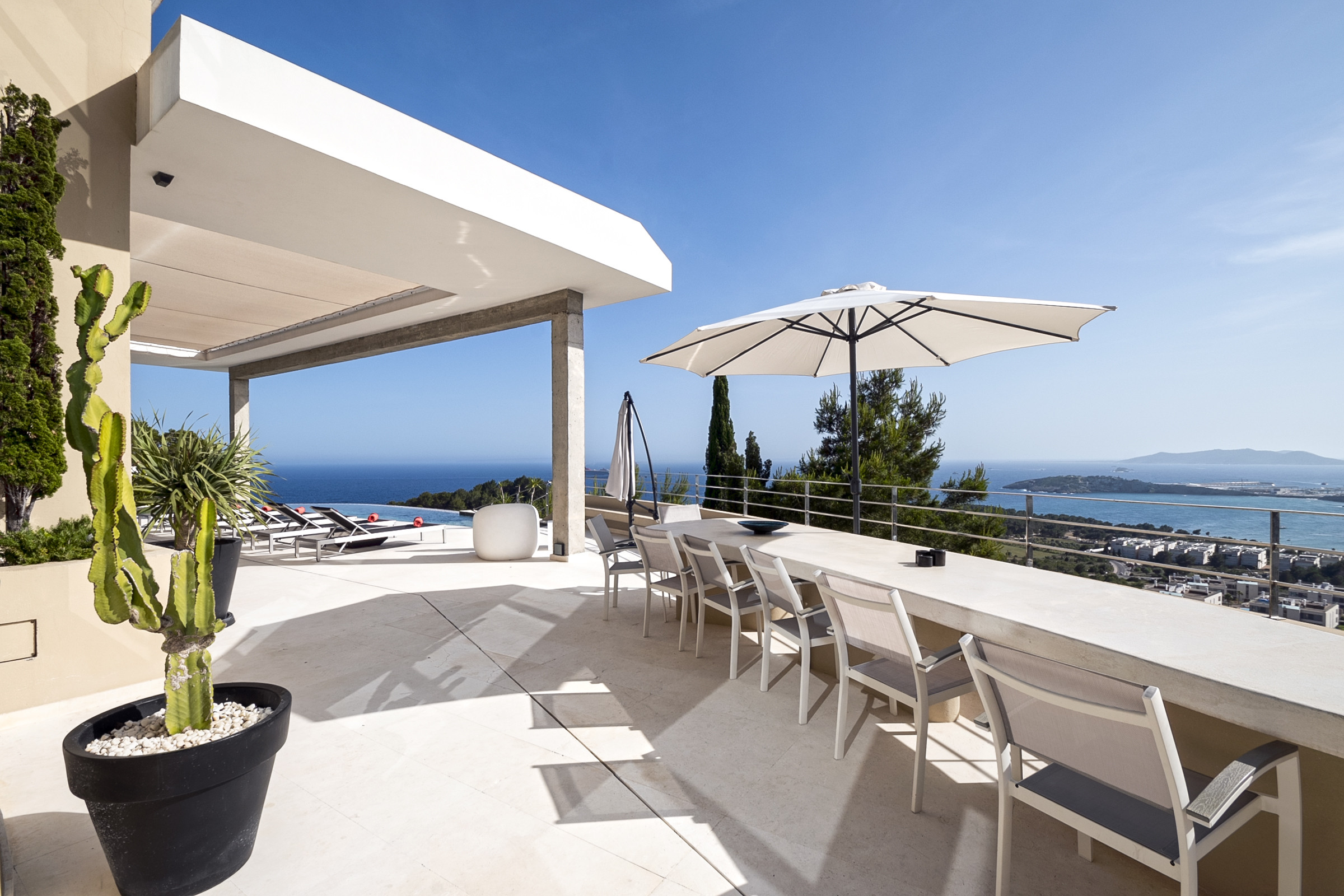 Villa Zafiro, im modernen und minimalistischen Stil. Sie wurde auf einer natürlichen Felsbasis errichtet, die sich in den Haupteingang integriert, gelegen im höchsten Bereich einer der exklusivsten Zonen der Insel und nur 10 Autominuten von der Stadt Ibiza entfernt. Von dort aus genießt man beeindruckende Panoramablicke, mehr als 180 Grad, die Formentera, die Burg von Ibiza und die kristallklaren Gewässer umfassen, die eine wunderschöne Landschaft schaffen.