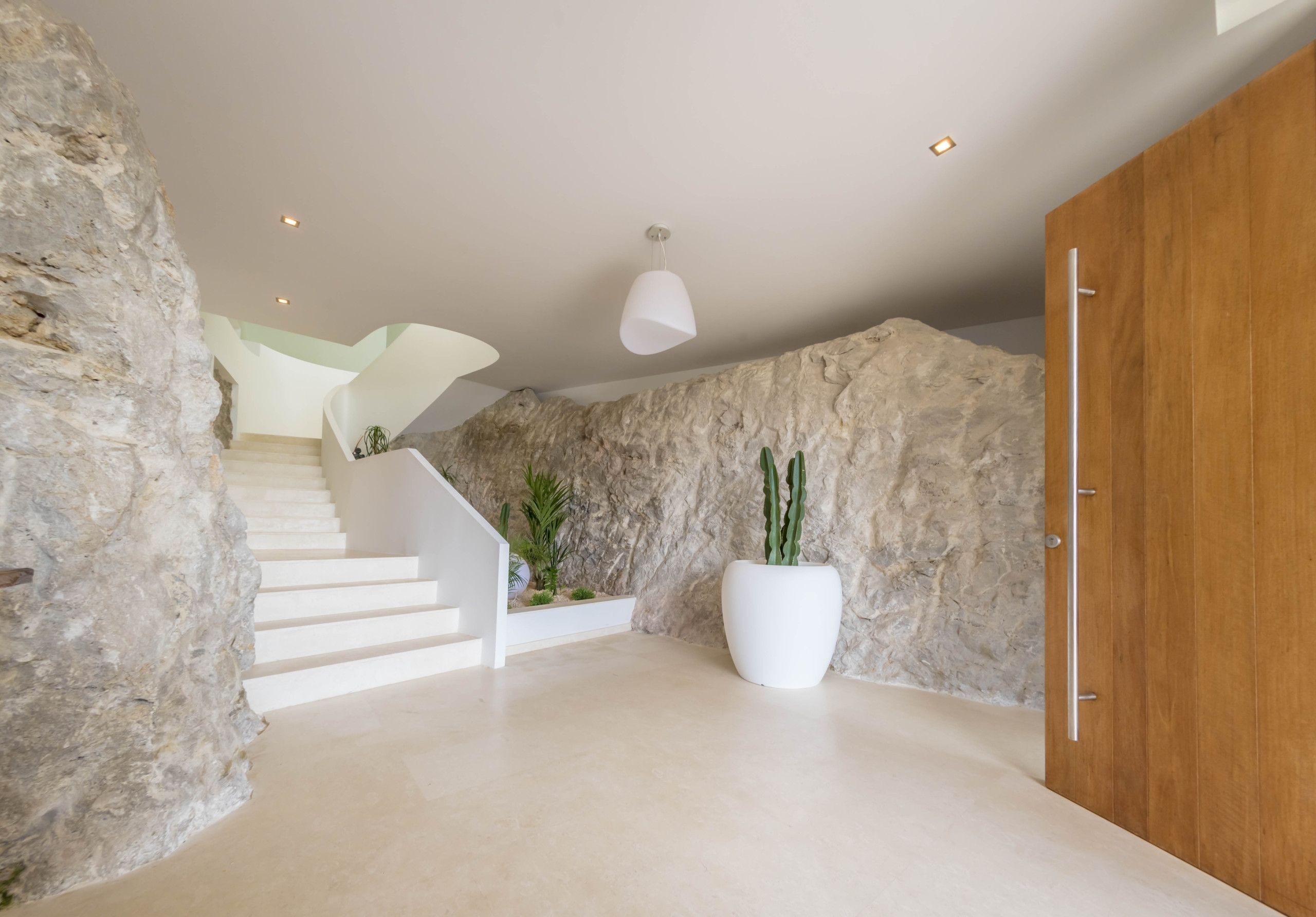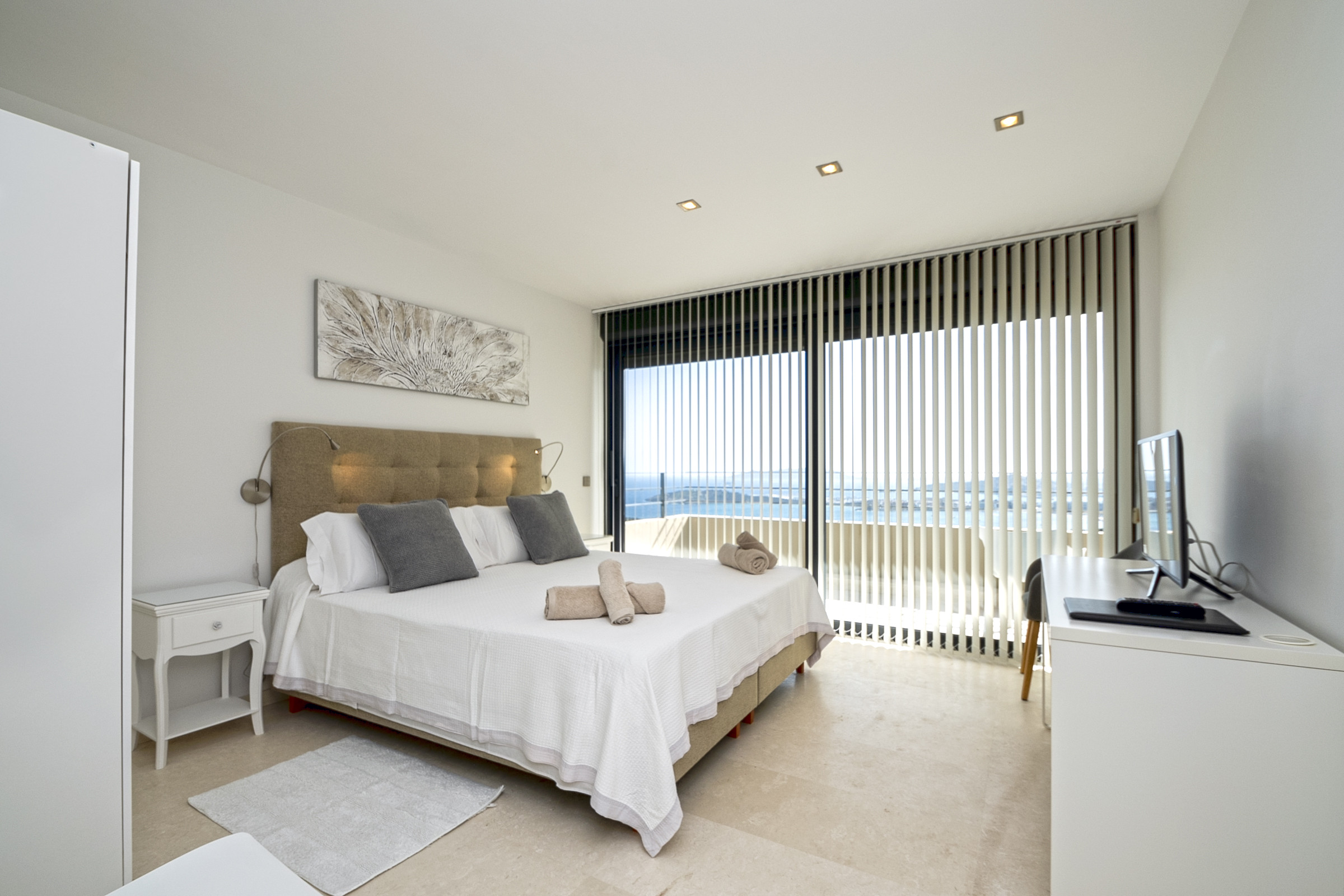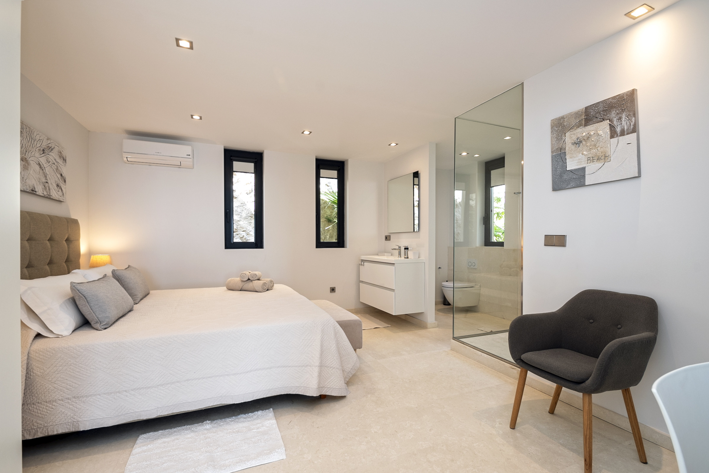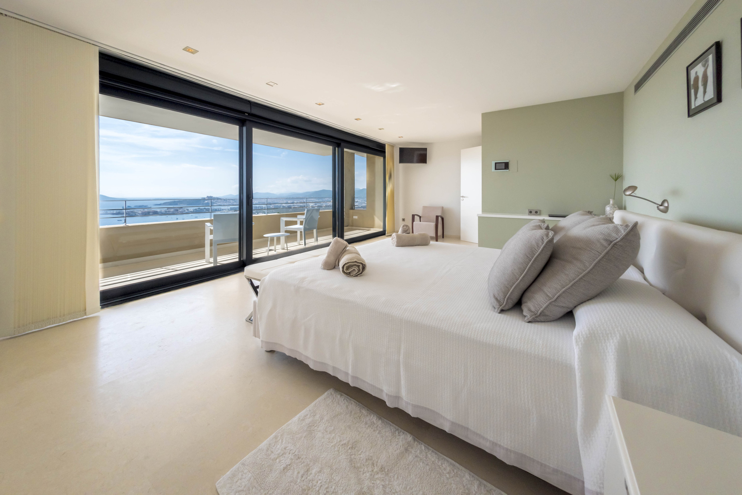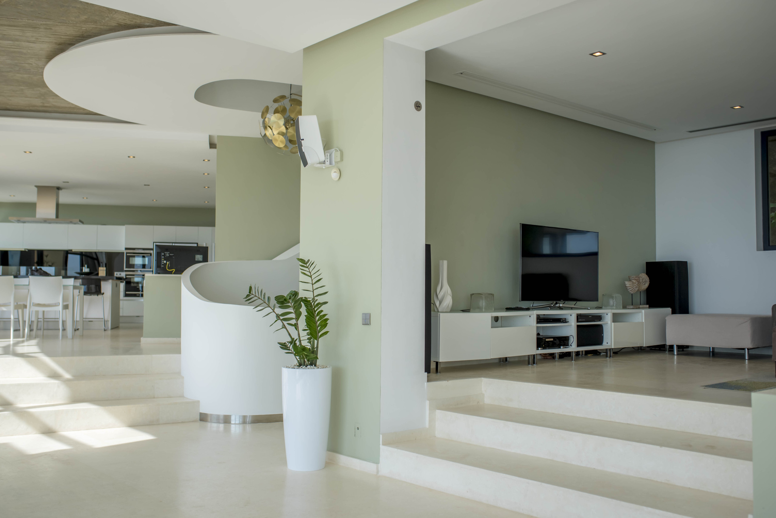 Villa Zafiro, im modernen und minimalistischen Stil. Sie wurde auf einer natürlichen Felsbasis errichtet, die sich in den Haupteingang integriert, gelegen im höchsten Bereich einer der exklusivsten Zonen der Insel und nur 10 Autominuten von der Stadt Ibiza entfernt. Von dort aus genießt man beeindruckende Panoramablicke, mehr als 180 Grad, die Formentera, die Burg von Ibiza und die kristallklaren Gewässer umfassen, die eine wunderschöne Landschaft schaffen.