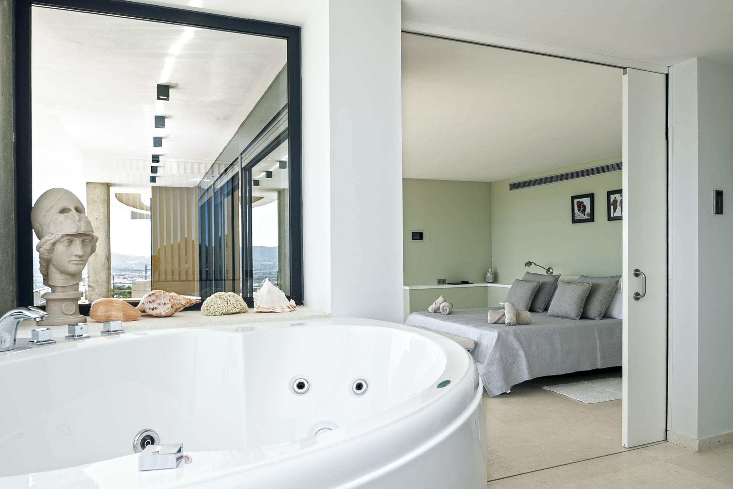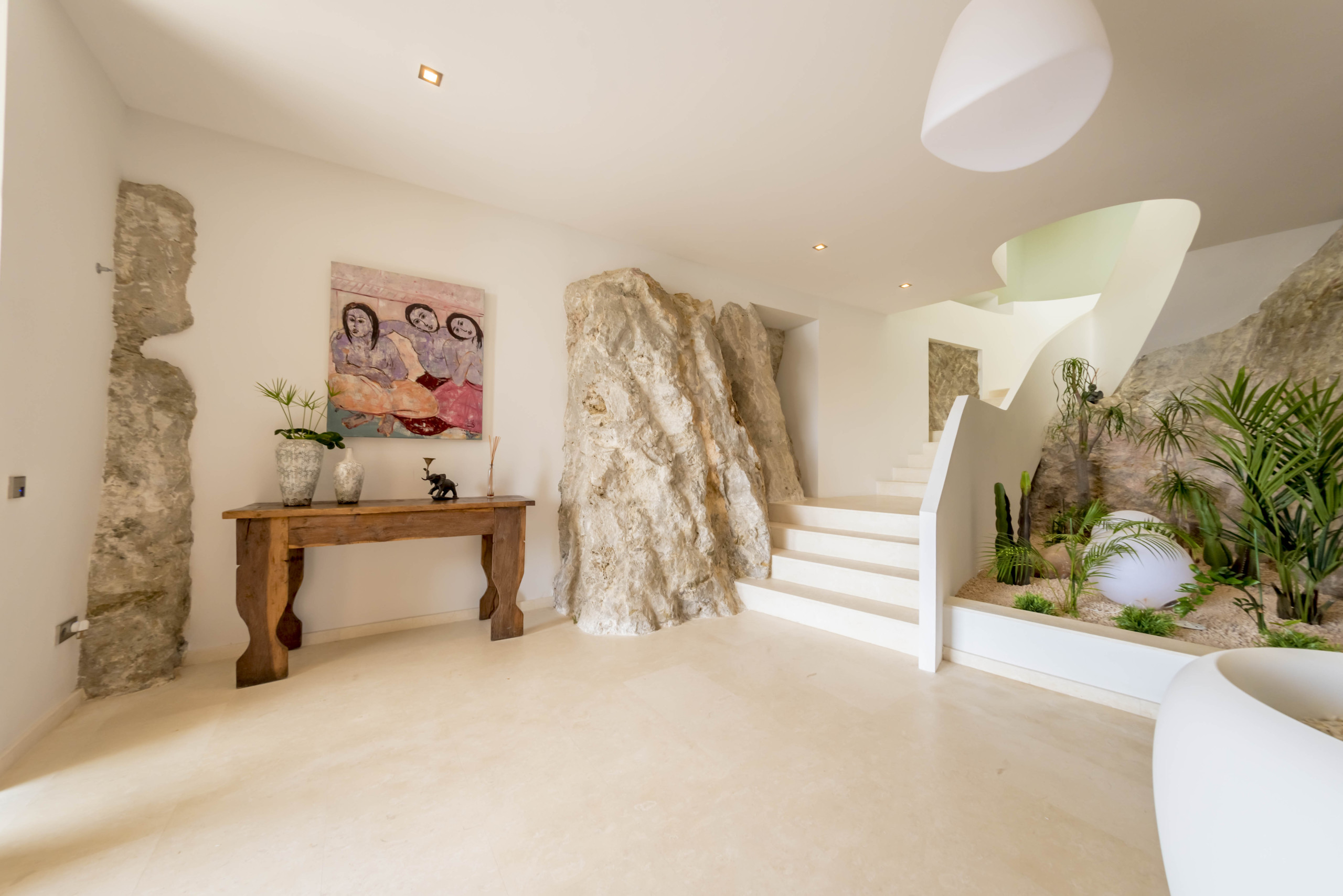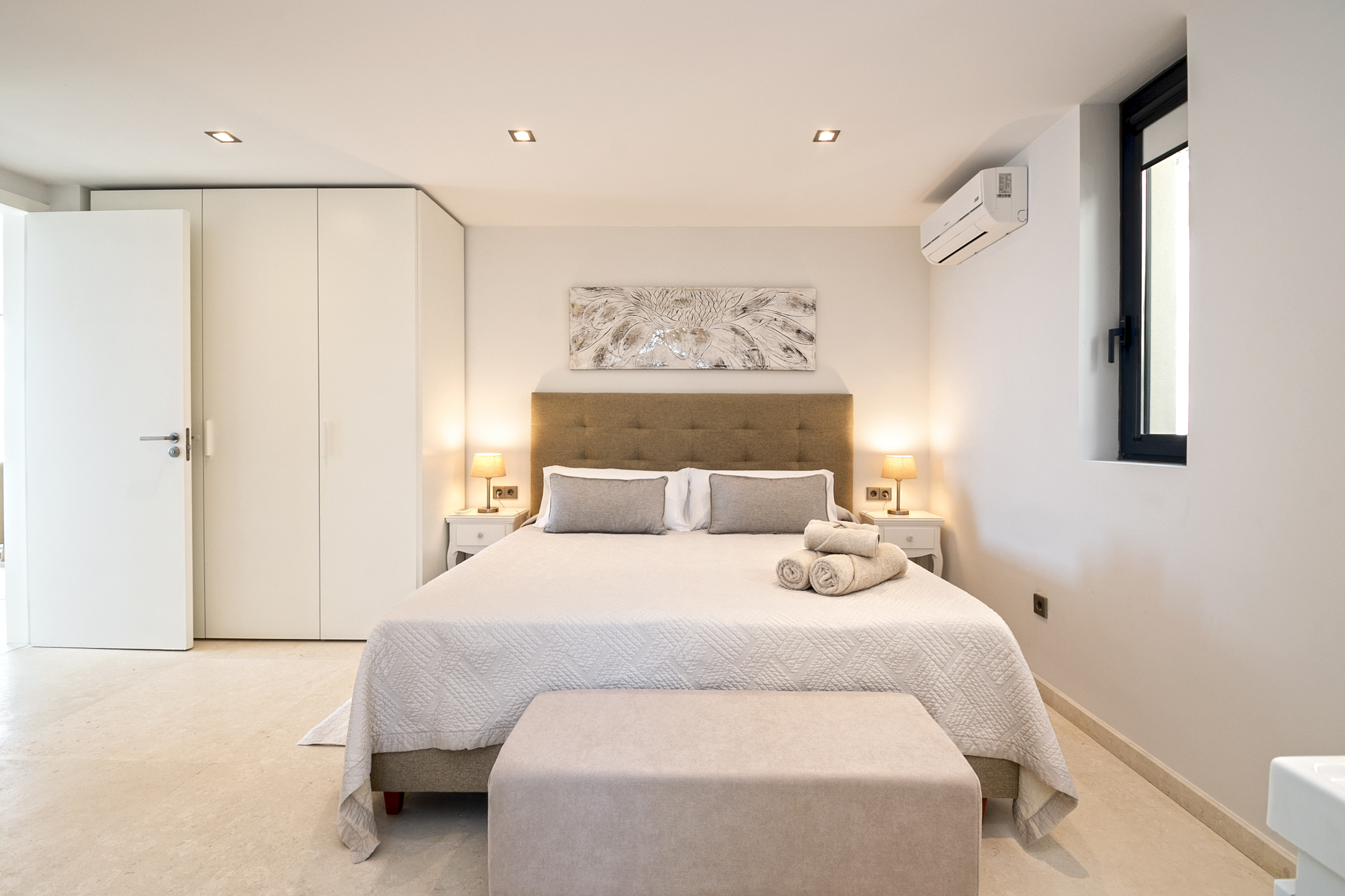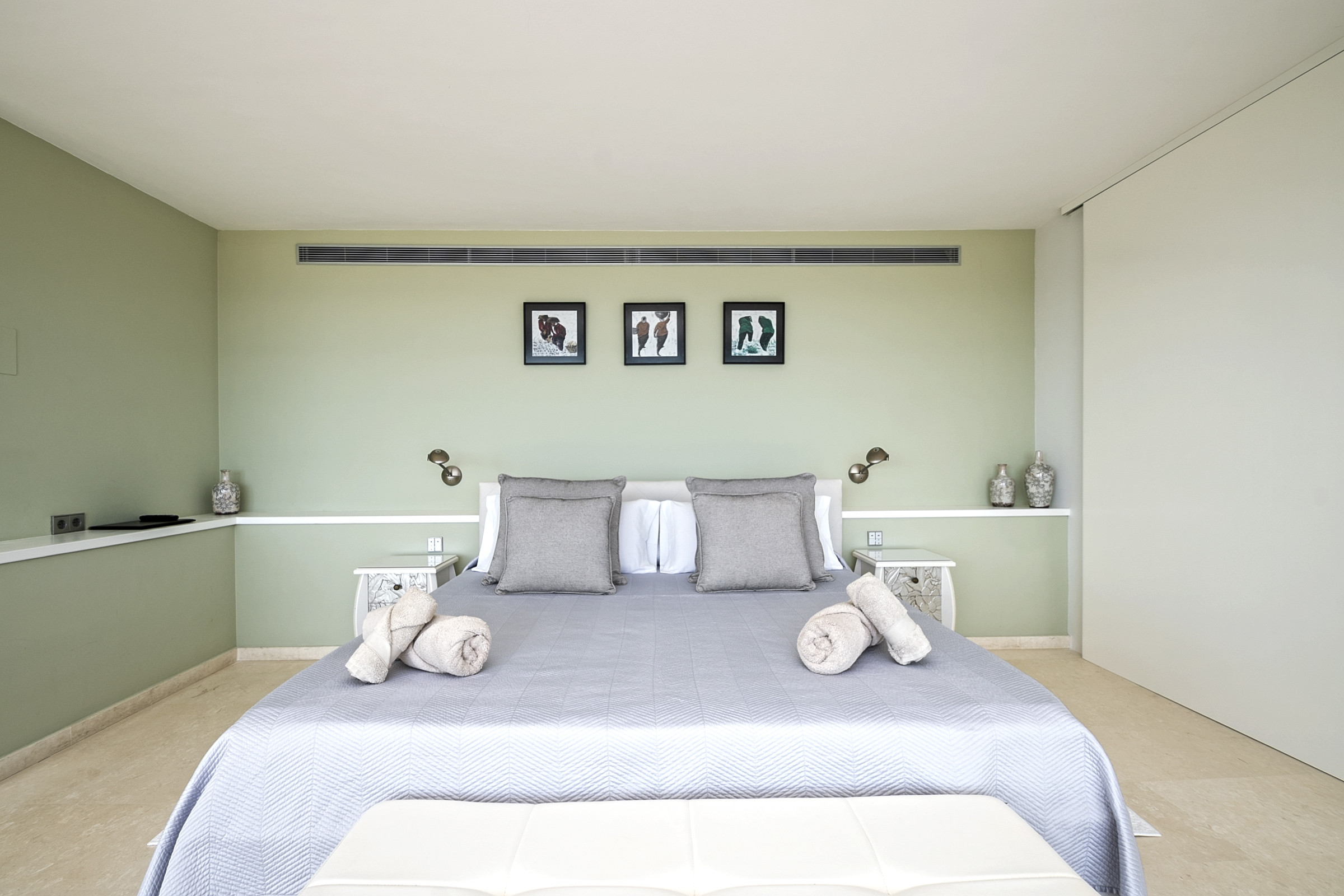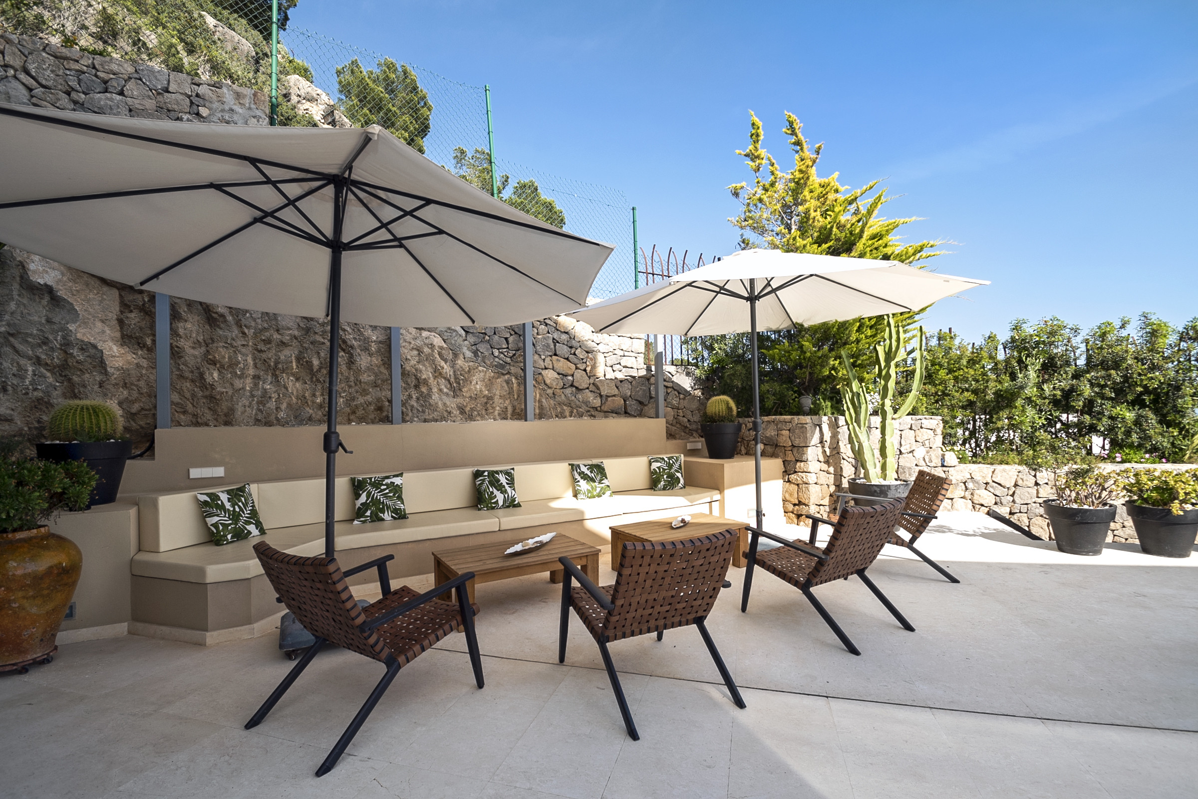 Villa Zafiro, im modernen und minimalistischen Stil. Sie wurde auf einer natürlichen Felsbasis errichtet, die sich in den Haupteingang integriert, gelegen im höchsten Bereich einer der exklusivsten Zonen der Insel und nur 10 Autominuten von der Stadt Ibiza entfernt. Von dort aus genießt man beeindruckende Panoramablicke, mehr als 180 Grad, die Formentera, die Burg von Ibiza und die kristallklaren Gewässer umfassen, die eine wunderschöne Landschaft schaffen.