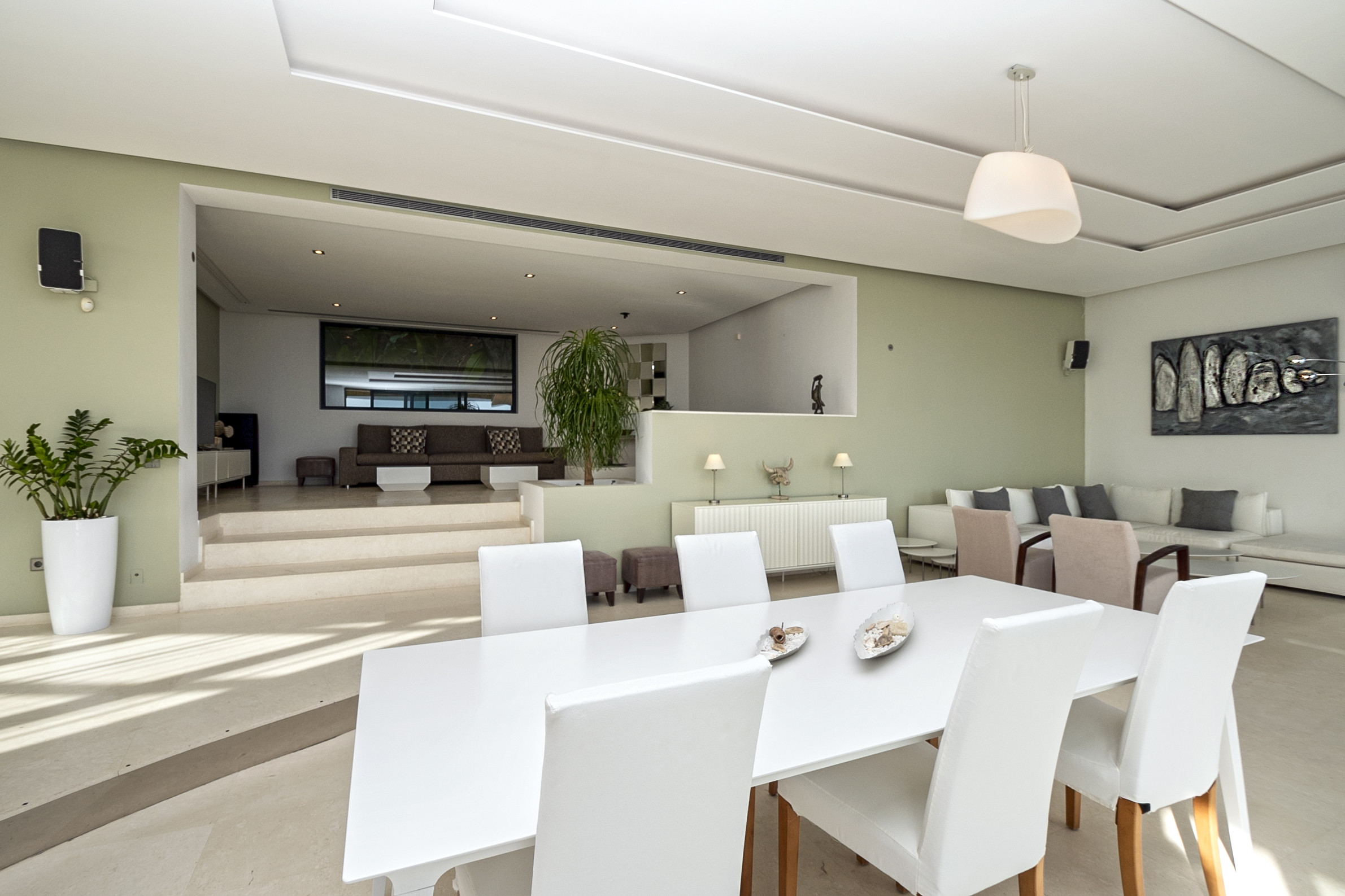 Im Erdgeschoss befinden sich ein großer Salon und Esszimmer, eine Relaxzone, eine voll ausgestattete und in den Salon und die Terrasse integrierte Küche, Waschmaschinenraum, Speisekammer, Gäste-WC und mehrere Terrassen.