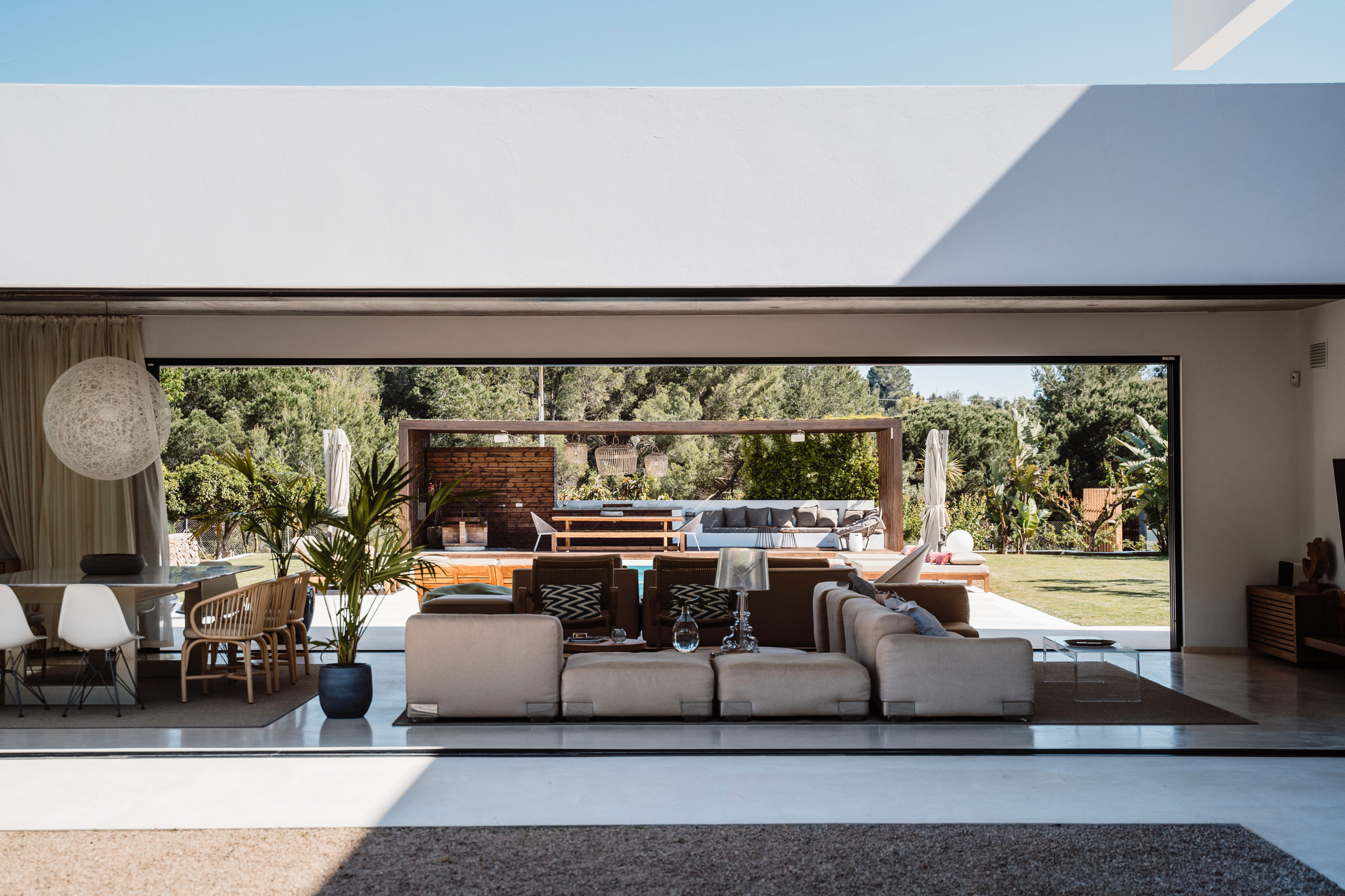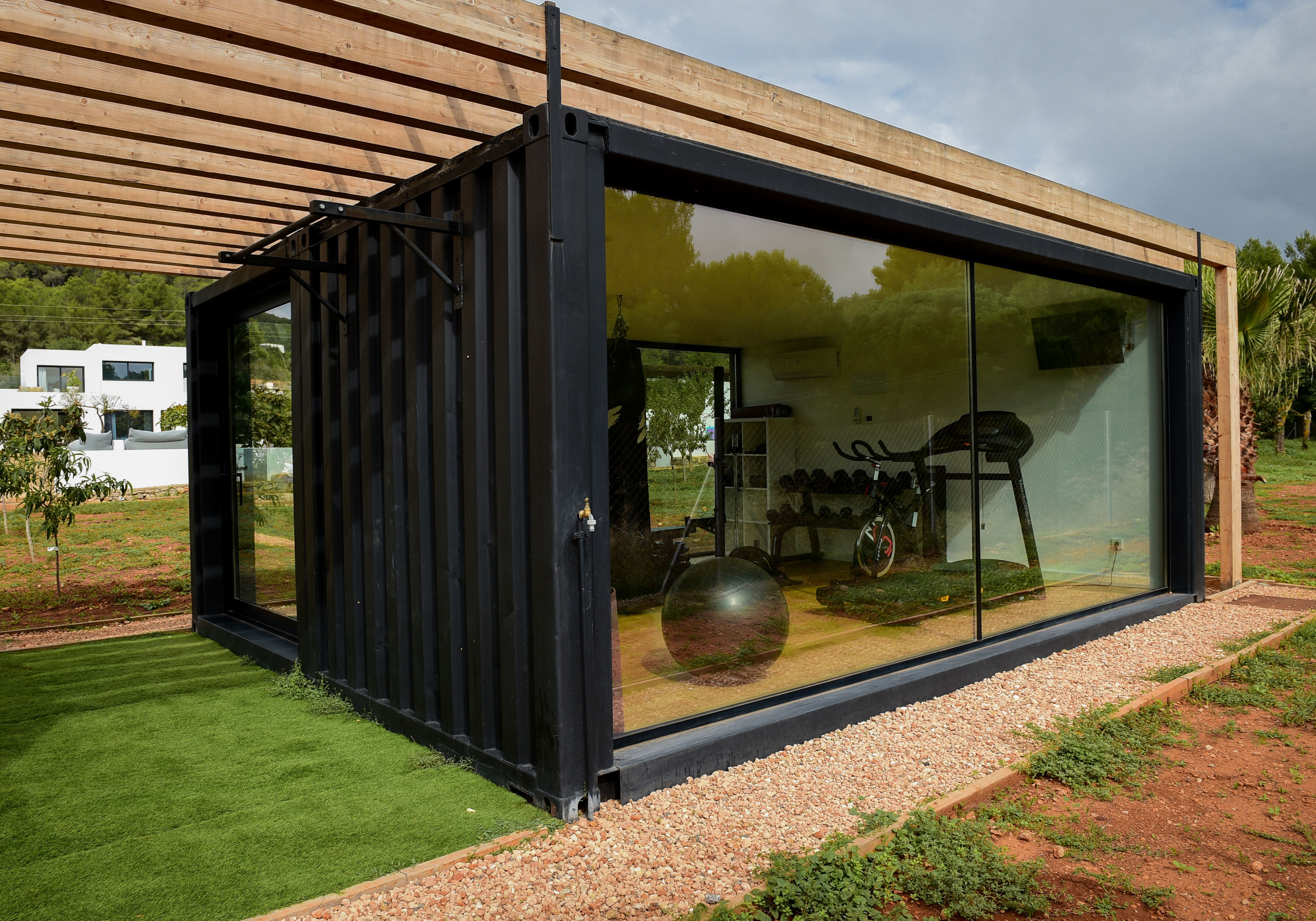 Im Außenbereich verfügt es über einen 14 x 5 m großen Salzwasserpool und einen Whirlpool, verschiedene Chill-out-Bereiche, Grill, Open-Air-Kino, einen Gemüsegarten mit saisonalen Obst und Gemüse, einen Kinderspielplatz im privaten Wald und ein Baumhaus aus Holz neben dem Haupthaus, einen Stall mit einem Pferd, das auf dem Grundstück lebt, ein Fitnessstudio und eine Kuppel zum Yoga-Machen.