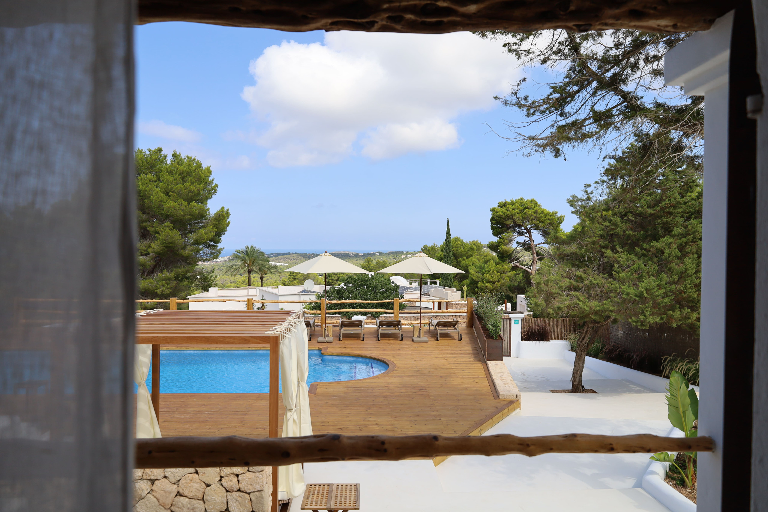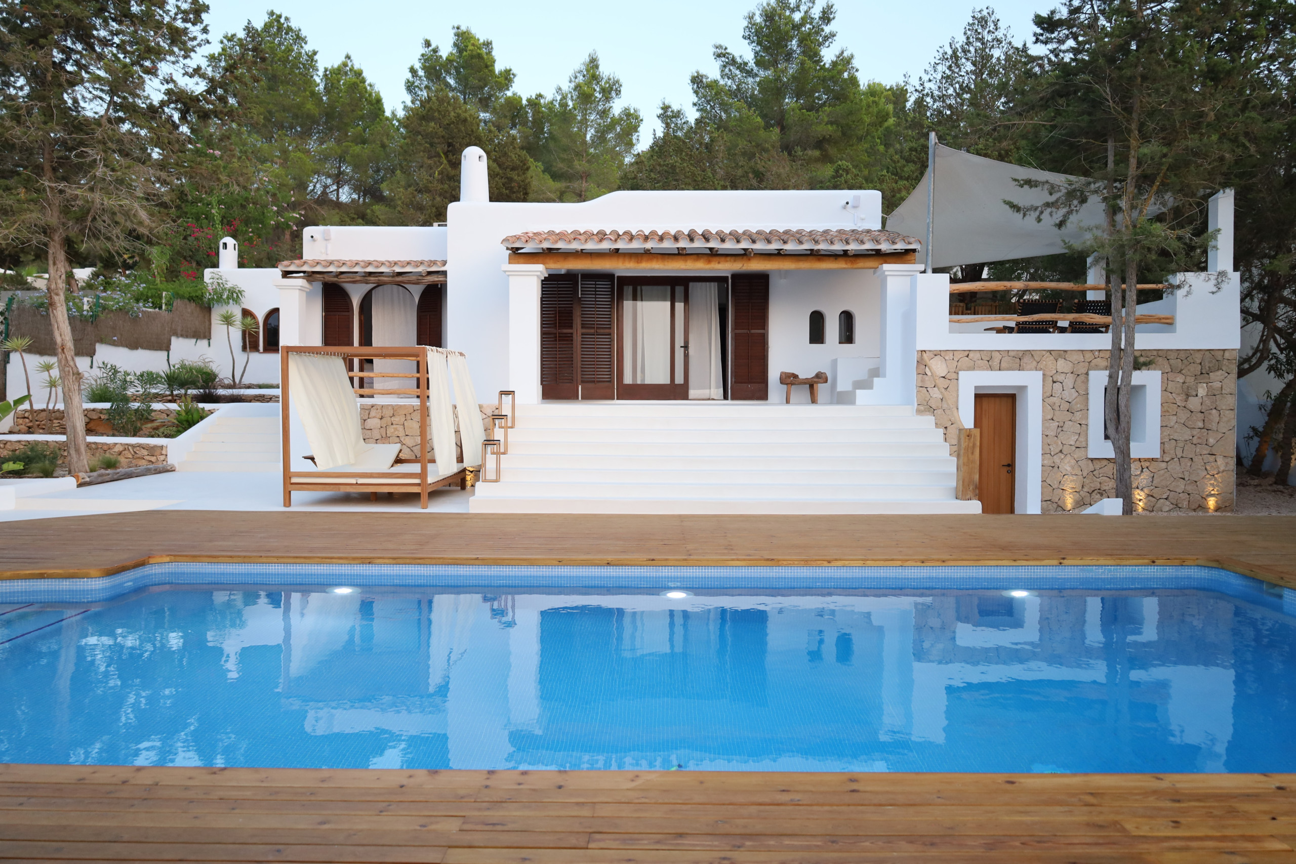 Im Außenbereich befindet sich ein 5 x 8m großer Swimmingpool, eine Chill-out-Zone neben dem Pool, von der aus man einen Blick auf das Meer und den Sonnenuntergang hat. Auf der Rückseite des Hauses neben dem Küchenanbau steht ein Holz-Baumhaus, das ideal für die Kleinsten ist.
