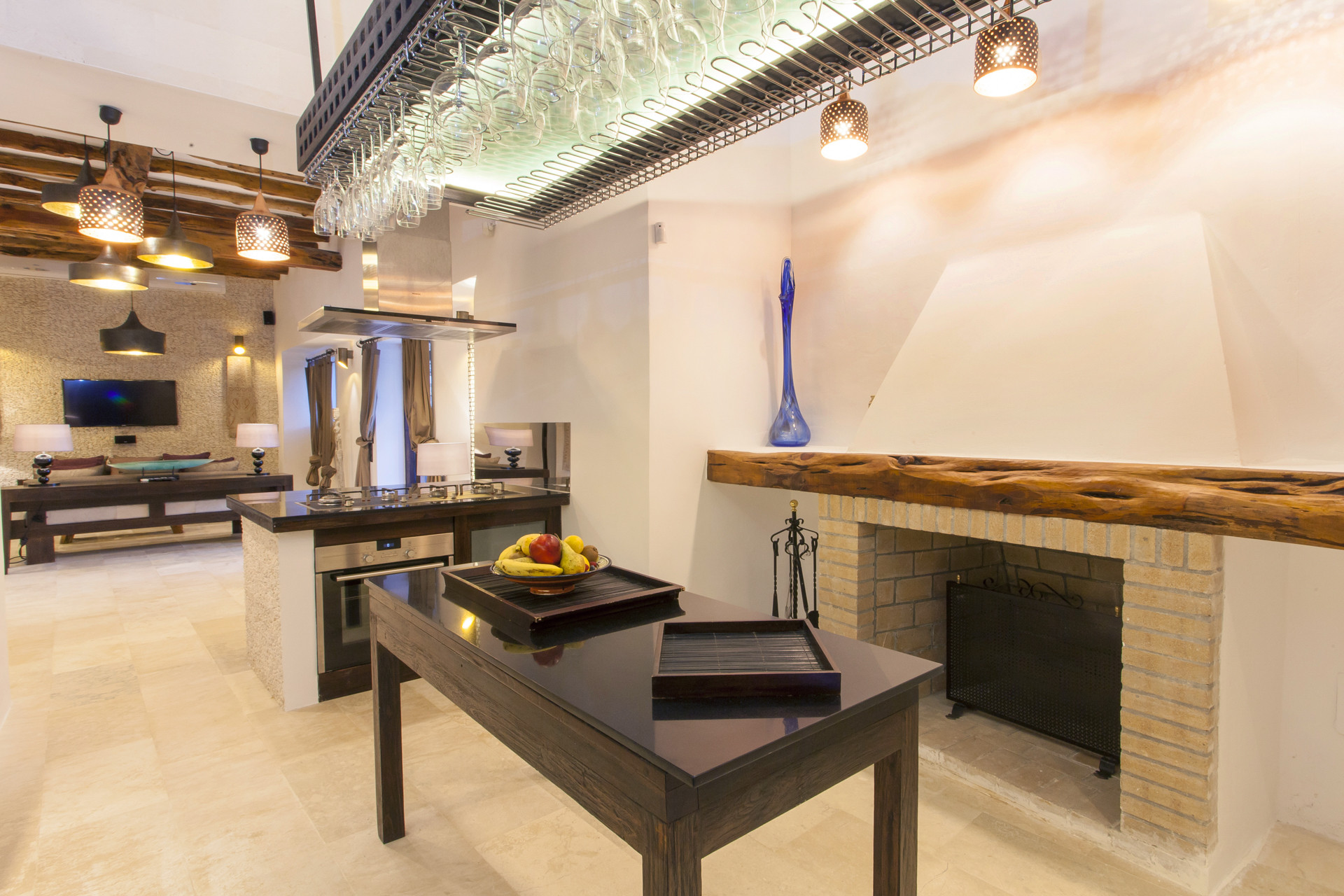 Das Haupthaus verfügt über einen Salon, eine sehr gut ausgestattete offene Küche und zwei Schlafzimmer mit Doppelbett und eigenem Badezimmer.