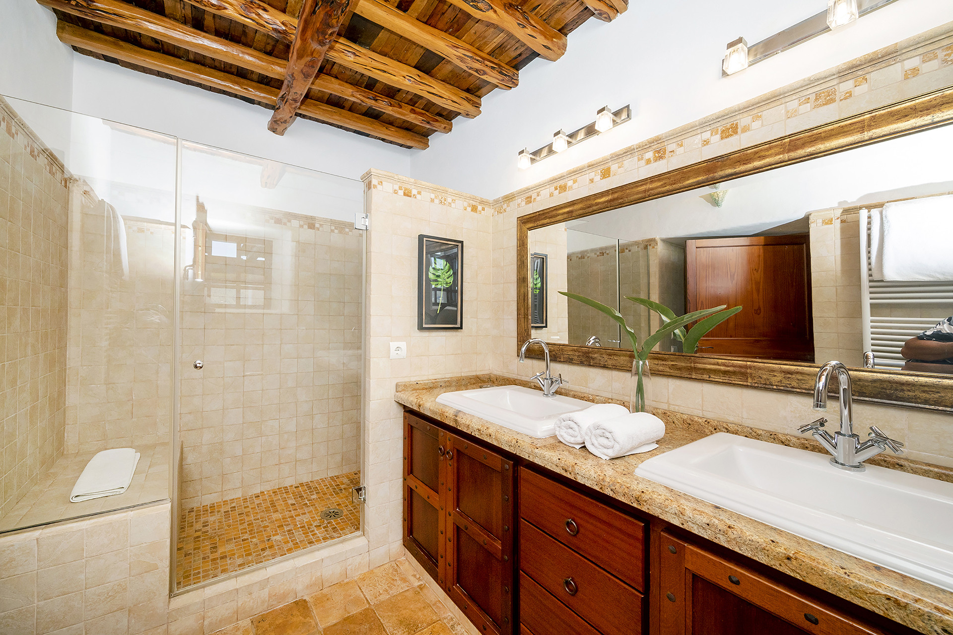 Die Villa erstreckt sich über eine einzige Etage und verfügt über einen geräumigen, sehr hellen Wohn-Essbereich mit großen Fenstern, Satelliten-TV und direktem Zugang zur Poolzone, eine vollständig ausgestattete Küche mit Siemens-Haushaltsgeräten, einen Waschraum mit Waschmaschine und Trockner sowie insgesamt 6 Doppelsuiten mit Betten, die auf Voranfrage getrennt werden können. Jedes Schlafzimmer verfügt über ein eigenes Badezimmer mit Dusche, TV und Safe.