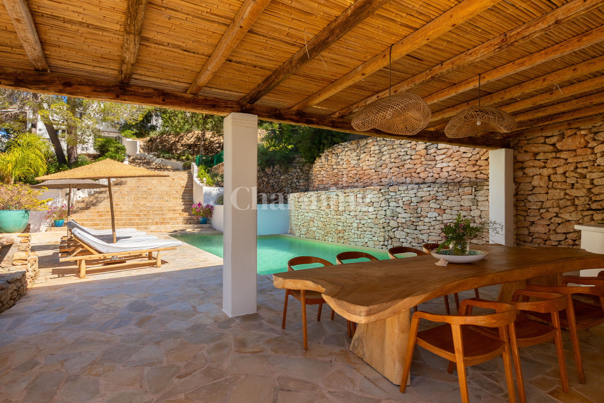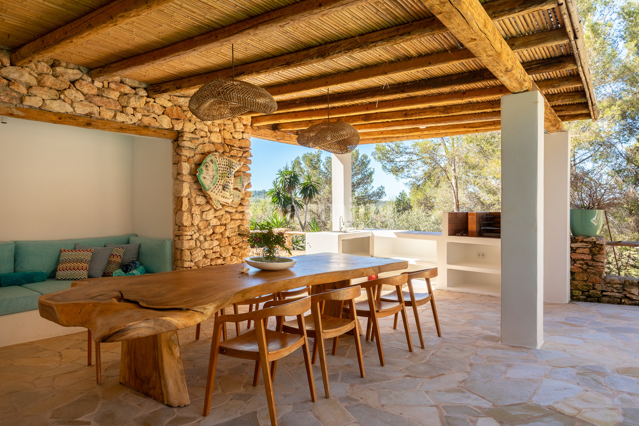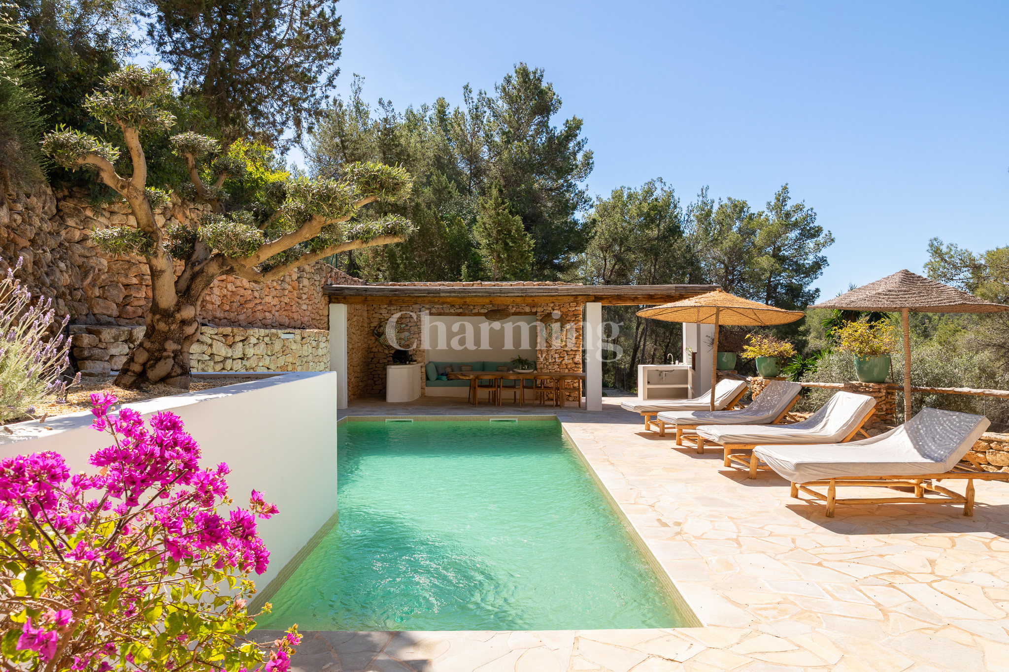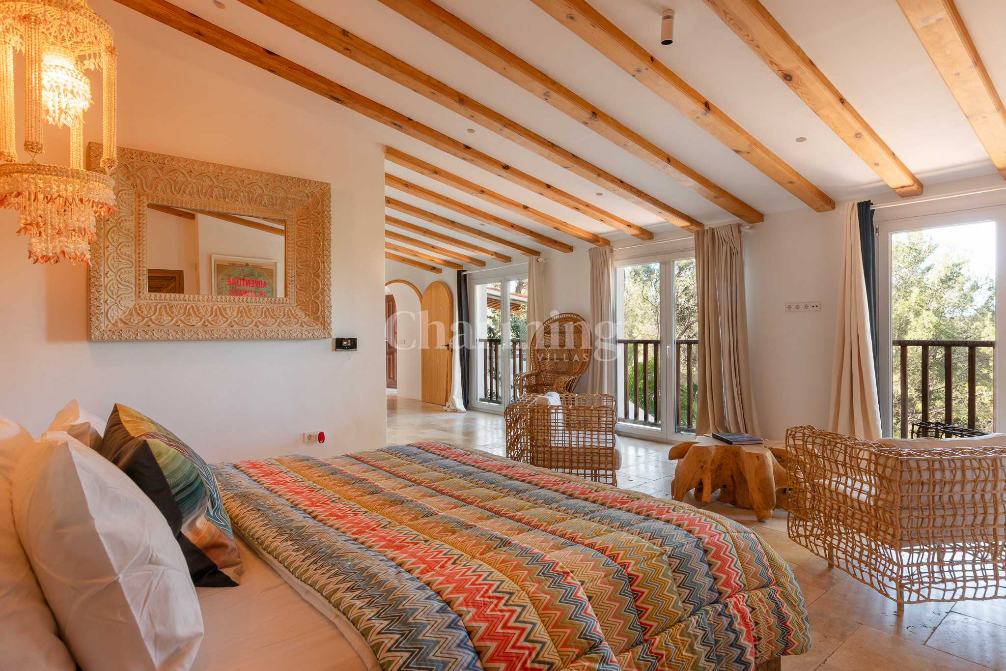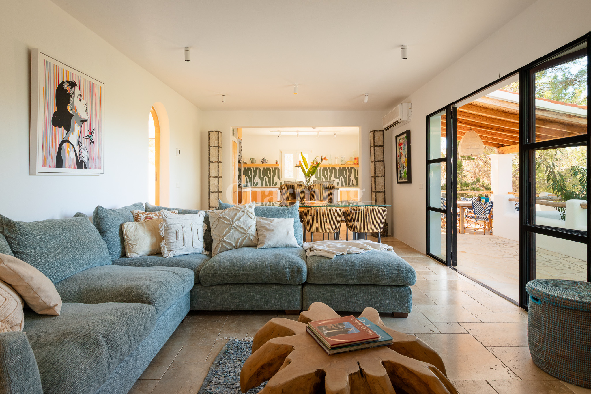 Villa Primavera is a beautiful villa that has been recently renovated and is located on a hill near the village of San Carlos. Its location is ideal as you can walk to the village, close to some of the most well-known restaurants in the area, the famous hippy market of Las Dalias and the new nightclub Akasha. By car, you can visit the spectacular beaches of Cala Llenya, Cala Nova and Aguas Blancas.