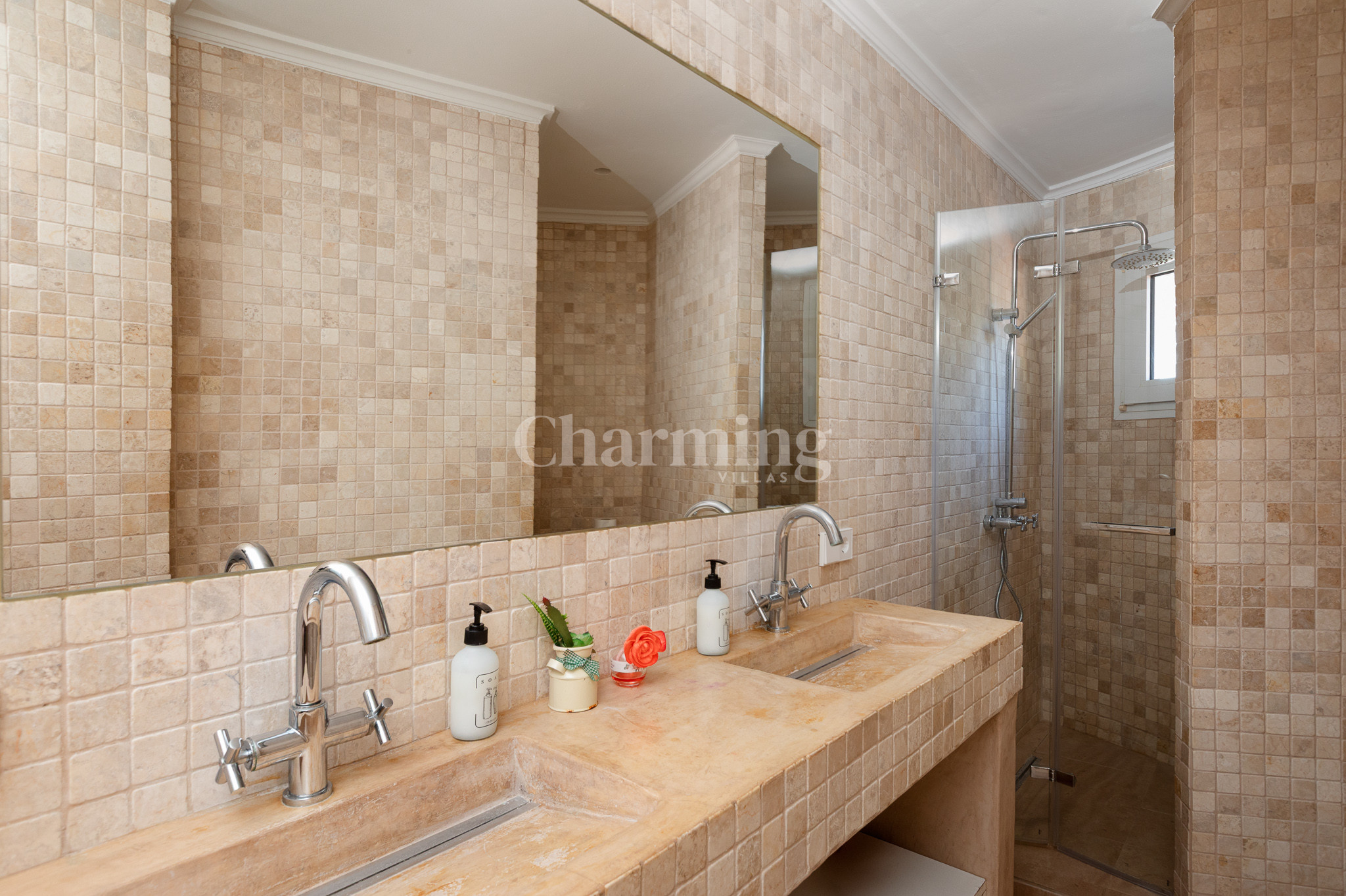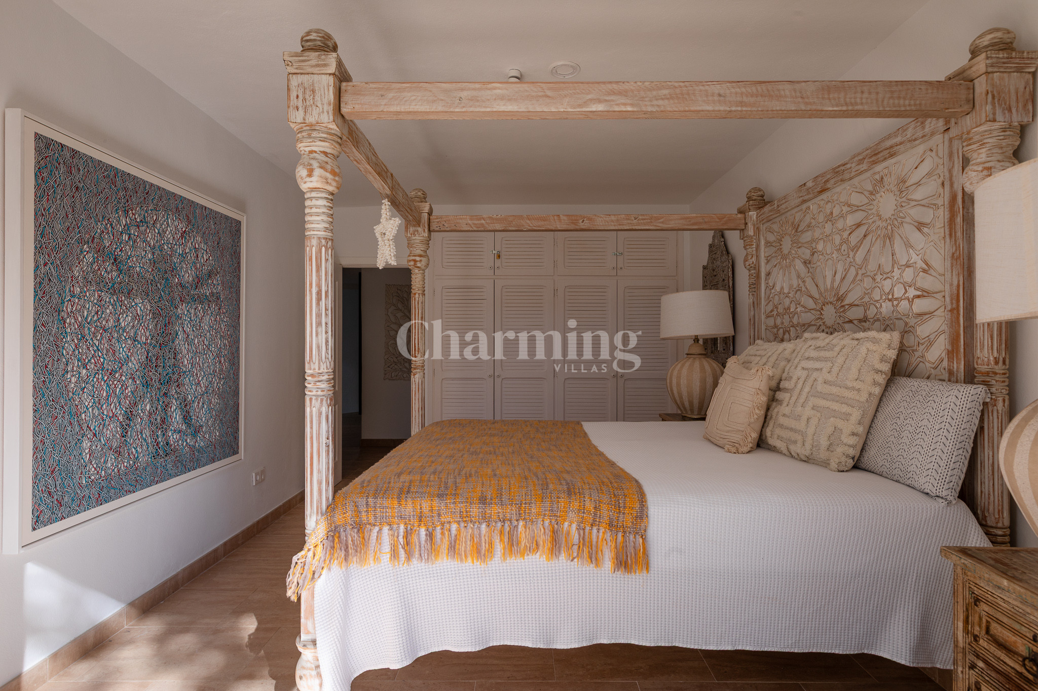 On the upper floor there are a total of three bedrooms, one of them with a double bed and an en-suite bathroom with a shower. A bedroom with a four-poster double bed and the last bedroom with two single beds. These two bedrooms share a bathroom located in the hallway. All bedrooms on this floor have access to a terrace.