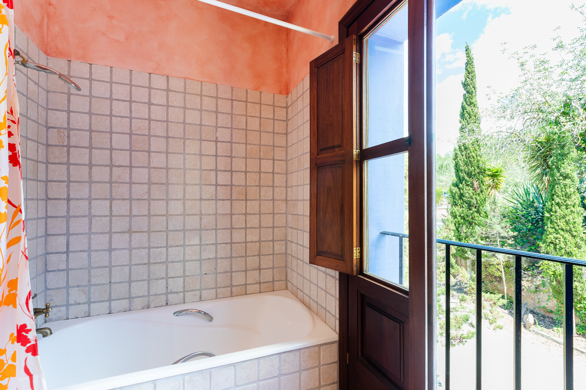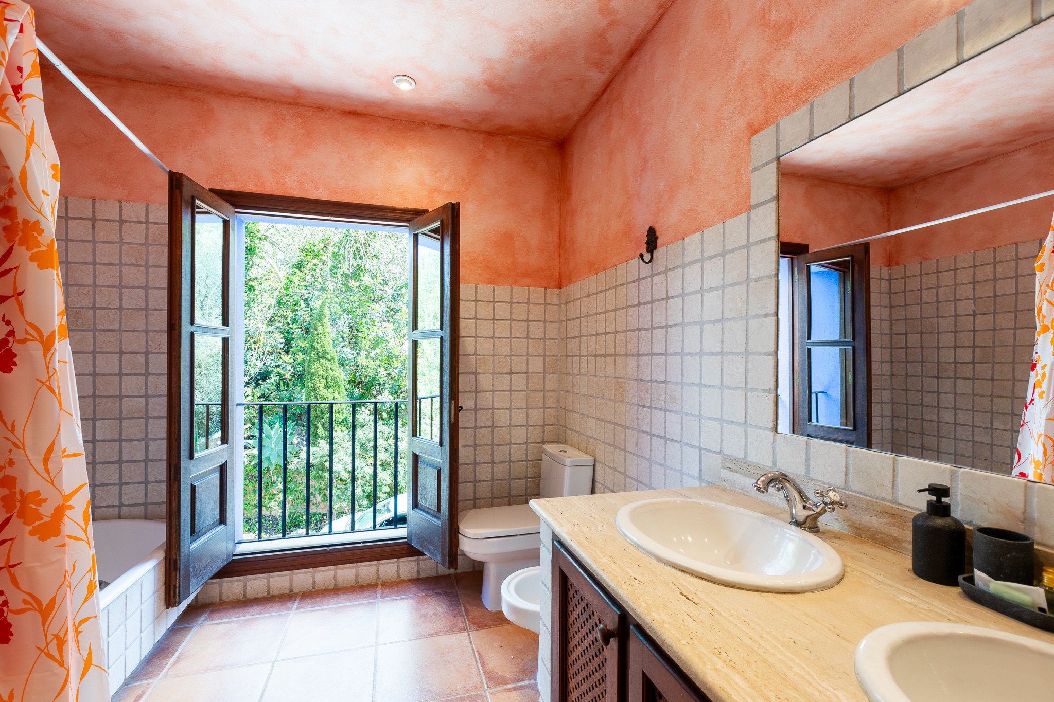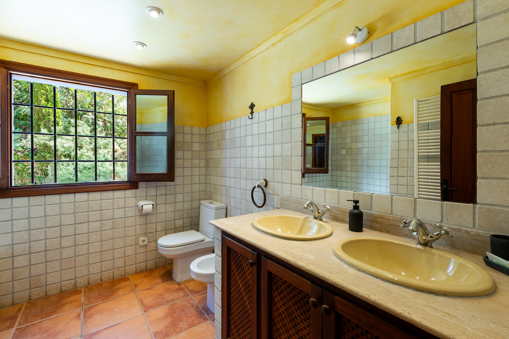Au premier étage se trouve un salon avec TV donnant accès à une terrasse. La chambre principale avec un lit de matrimonial, dressing, climatisation, salle de bain attenante avec baignoire et douche séparée. Deux chambres, chacune avec 2 lits de 90 x 180 cm et ventilateur de plafond (sans climatisation). Et la cinquième chambre avec un lit de 150 x 180 cm et climatisation. Et une salle de bain avec baignoire partagée entre les trois chambres, située dans le couloir.