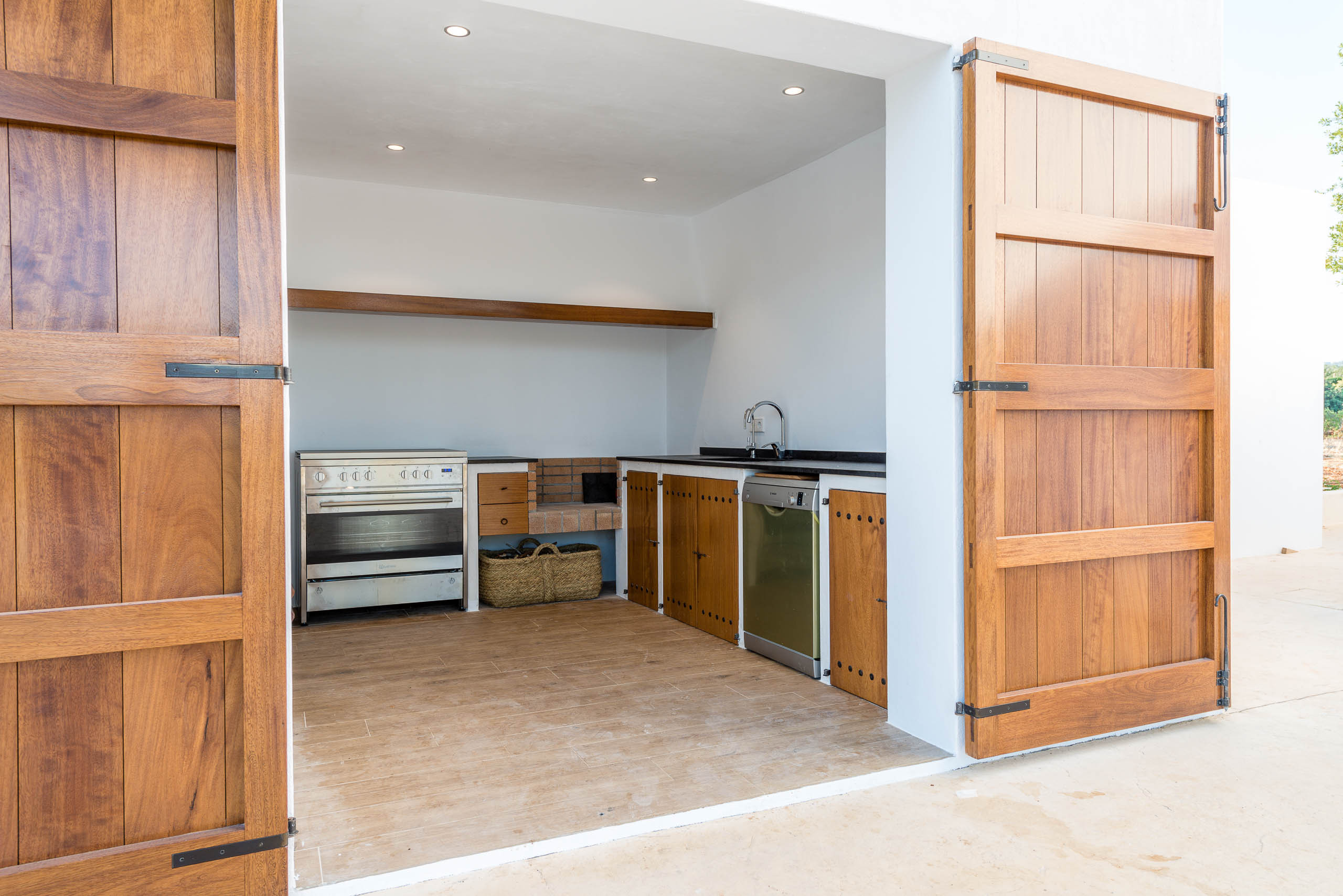 La propriété dispose de deux cuisines entièrement équipées : une intérieure, connectée à un vaste salon-salle à manger de conception ouverte avec cheminée trois faces, et une extérieure à côté de la zone piscine, équipée d'un four, d'un réfrigérateur et d'un barbecue à charbon, conçue pour profiter de repas en plein air.
