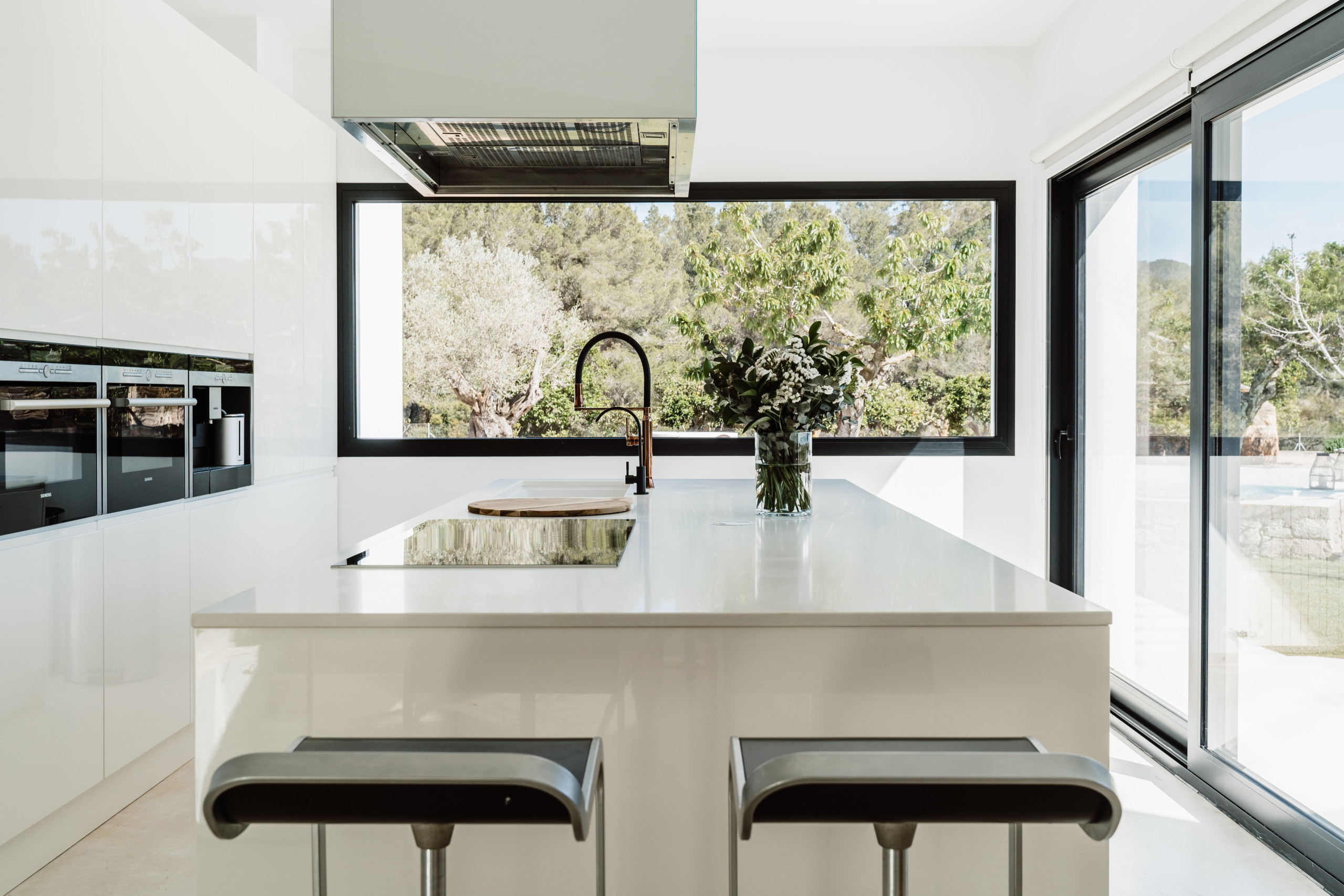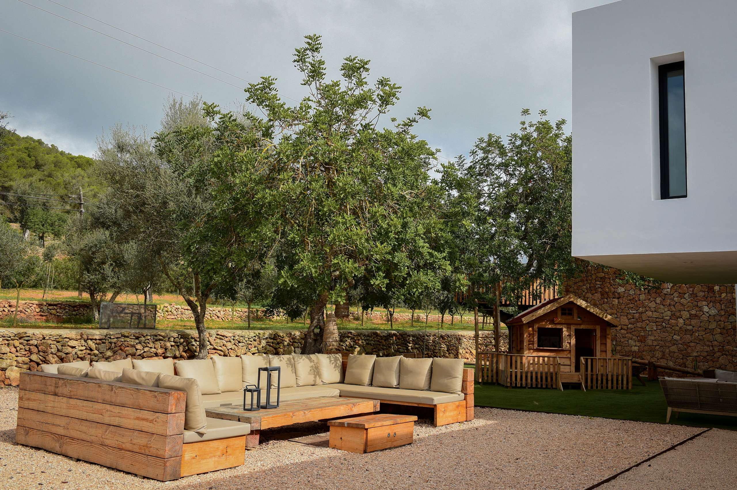 À l'extérieur, il dispose d'une piscine de 14 x 5 m d'eau salée et d'un jacuzzi, différentes zones chill-out, barbecue, cinéma en plein air, potager avec des fruits et légumes de saison, aire de jeux pour enfants située dans la forêt privée et une cabane dans les arbres en bois à côté de la maison principale, une écurie avec un cheval qui vit sur la propriété, une salle de sport et un dôme pour faire du yoga.