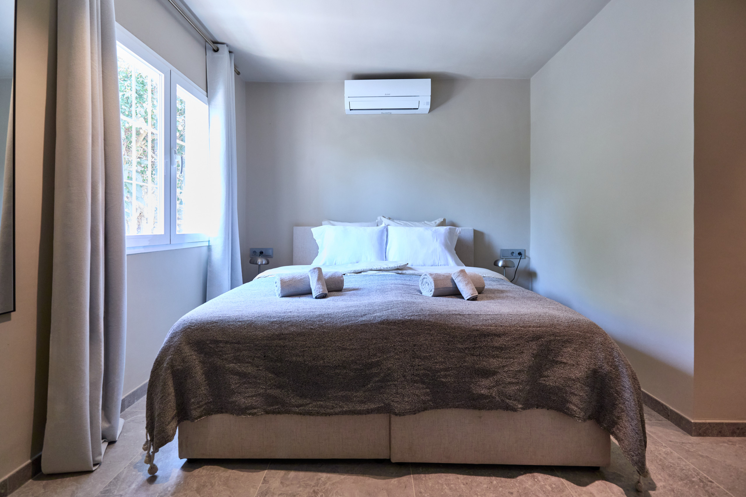 La villa dispose de 3 chambres spacieuses, chacune avec climatisation et accès direct à la piscine et au jardin. La chambre principale comprend une salle de bain attenante, tandis que les deux autres partagent une salle de bain. Les lits individuels de 90x200 cm peuvent être préparés en lit double ou rester séparés, à condition d'en être informé à l'avance.