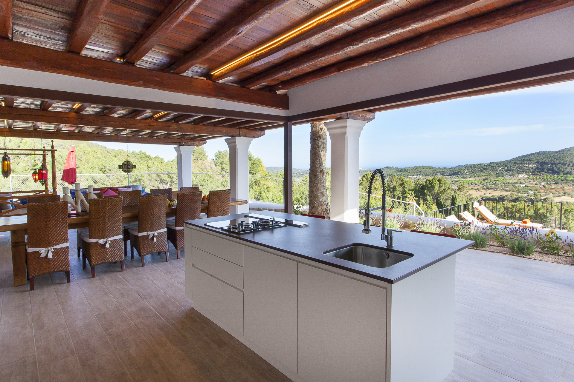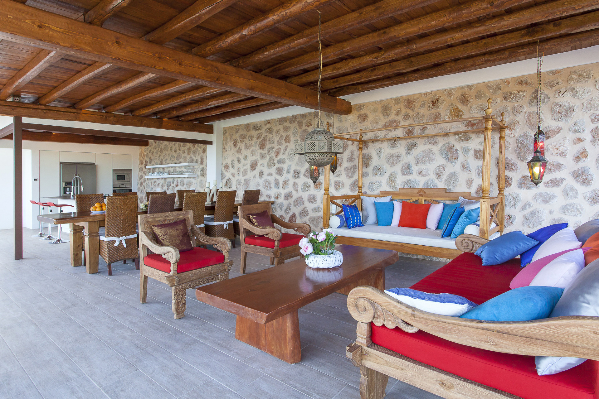 La zone extérieure est conçue pour la détente, avec une large terrasse couverte de poutres en bois, des zones chill-out avec des canapés confortables et des lampes de style oriental. L'aire de repas extérieure, équipée d'une grande table en bois massif qui se connecte directement à la piscine.