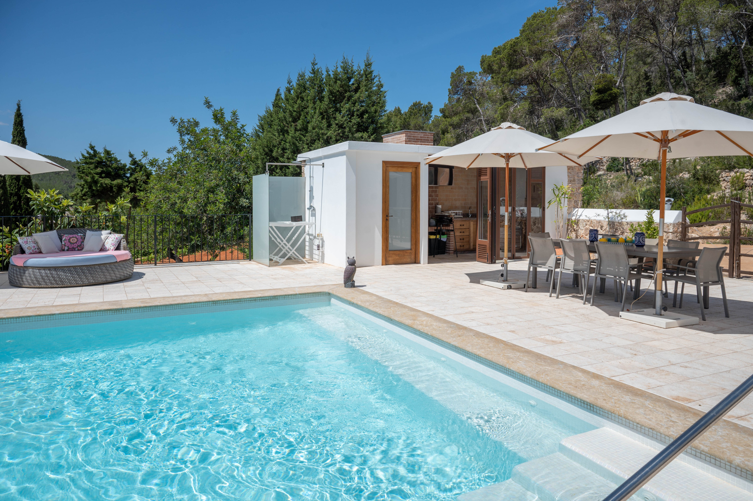La piscina si può riscaldare nei mesi più freschi ed è circondata da lettini e letti, oltre a un ristorante all'aperto, una piccola cucina con barbecue a gas e un bagno vicino alla piscina.