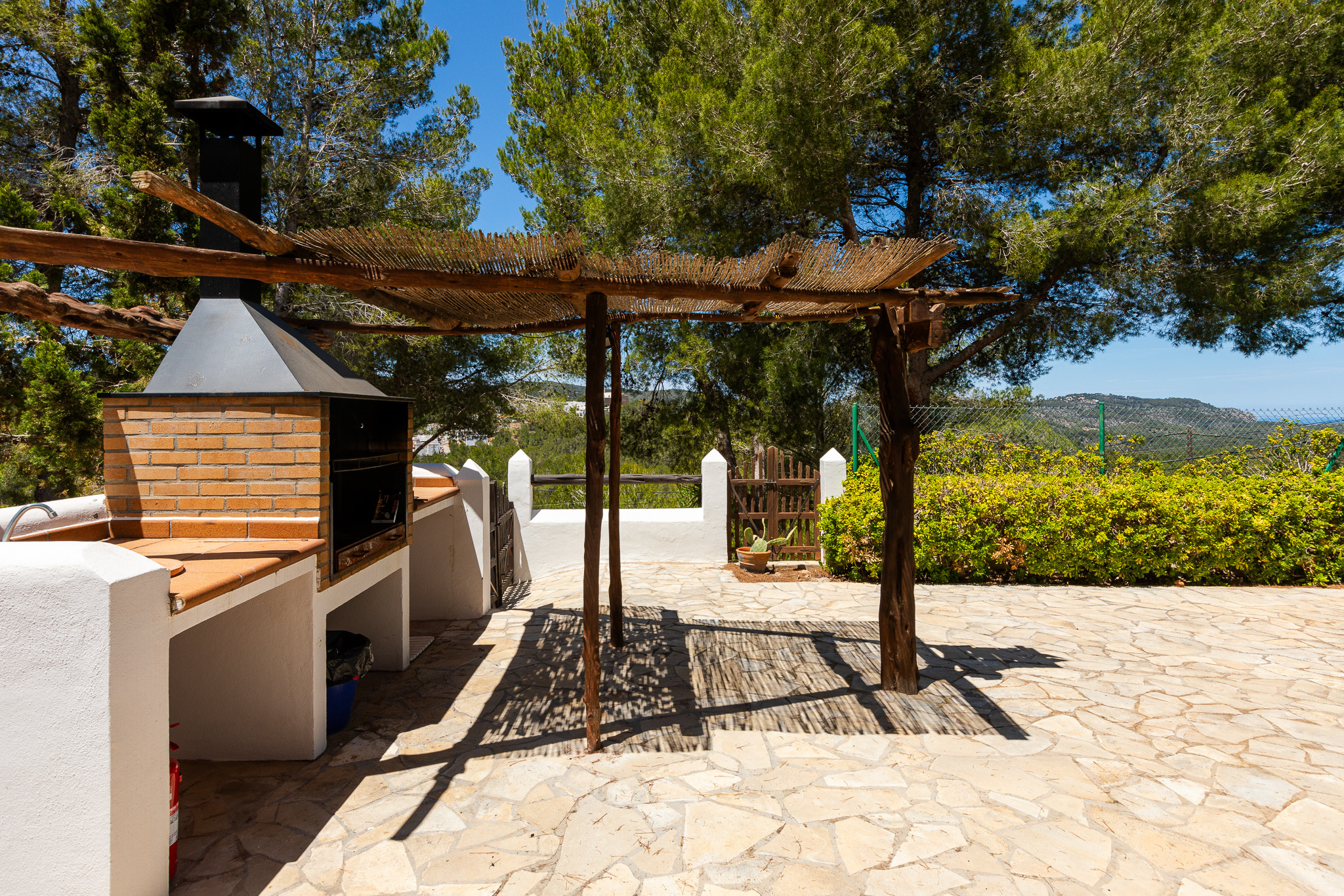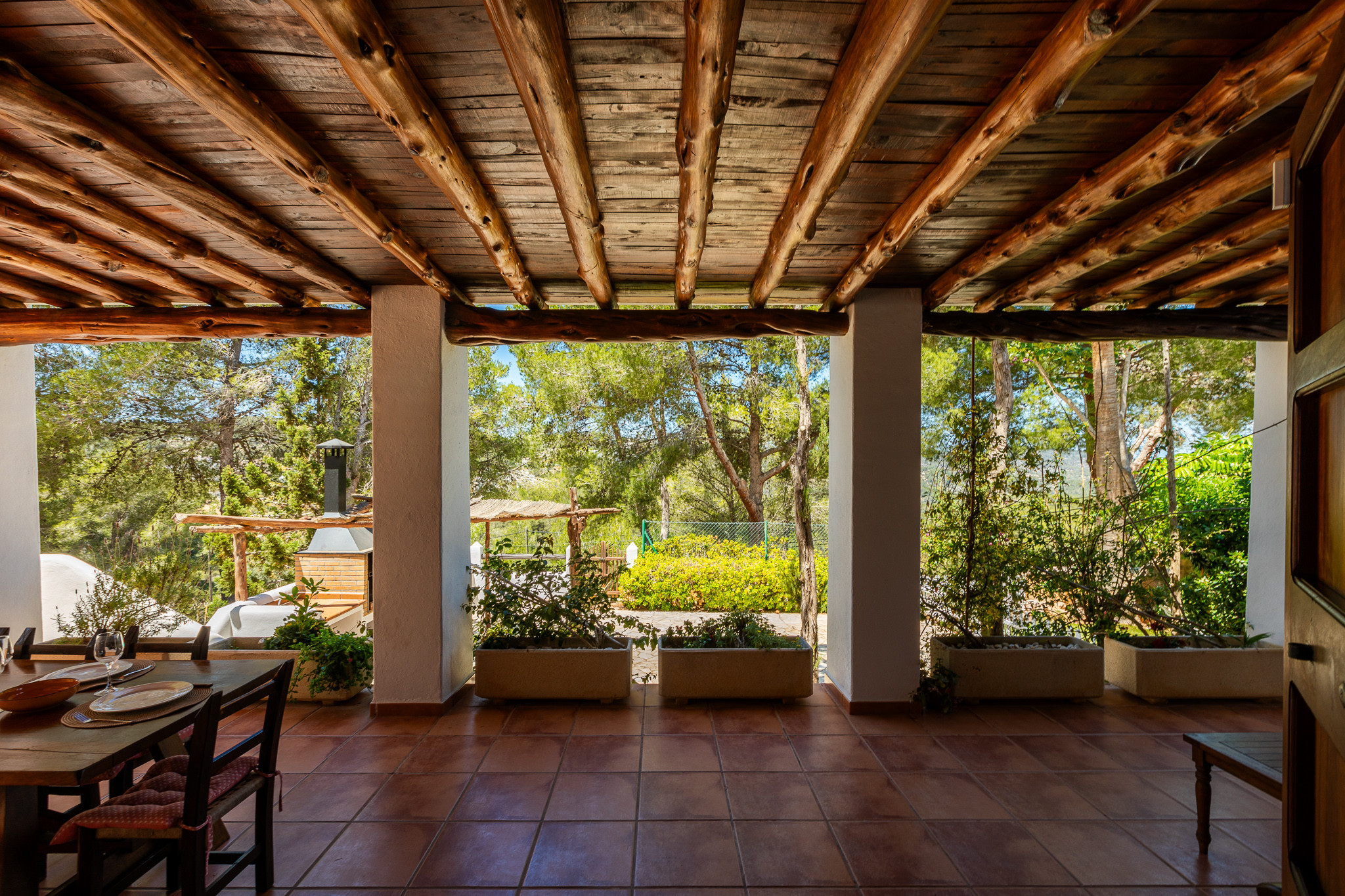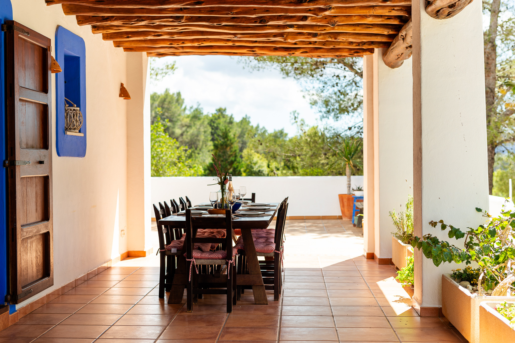 Buiten is er een overdekt terras met savina balken, een grote eettafel en een pingpongtafel. Beneden aan de trap bevinden zich de barbecue en het zwembad van 11 x 5m met een Balinees bed en ligbedden. Vanuit de zwemzone kan men de kerk van San Miguel en de zee op de achtergrond bekijken, en bovendien genieten van prachtige zonsondergangen tussen de bergen.