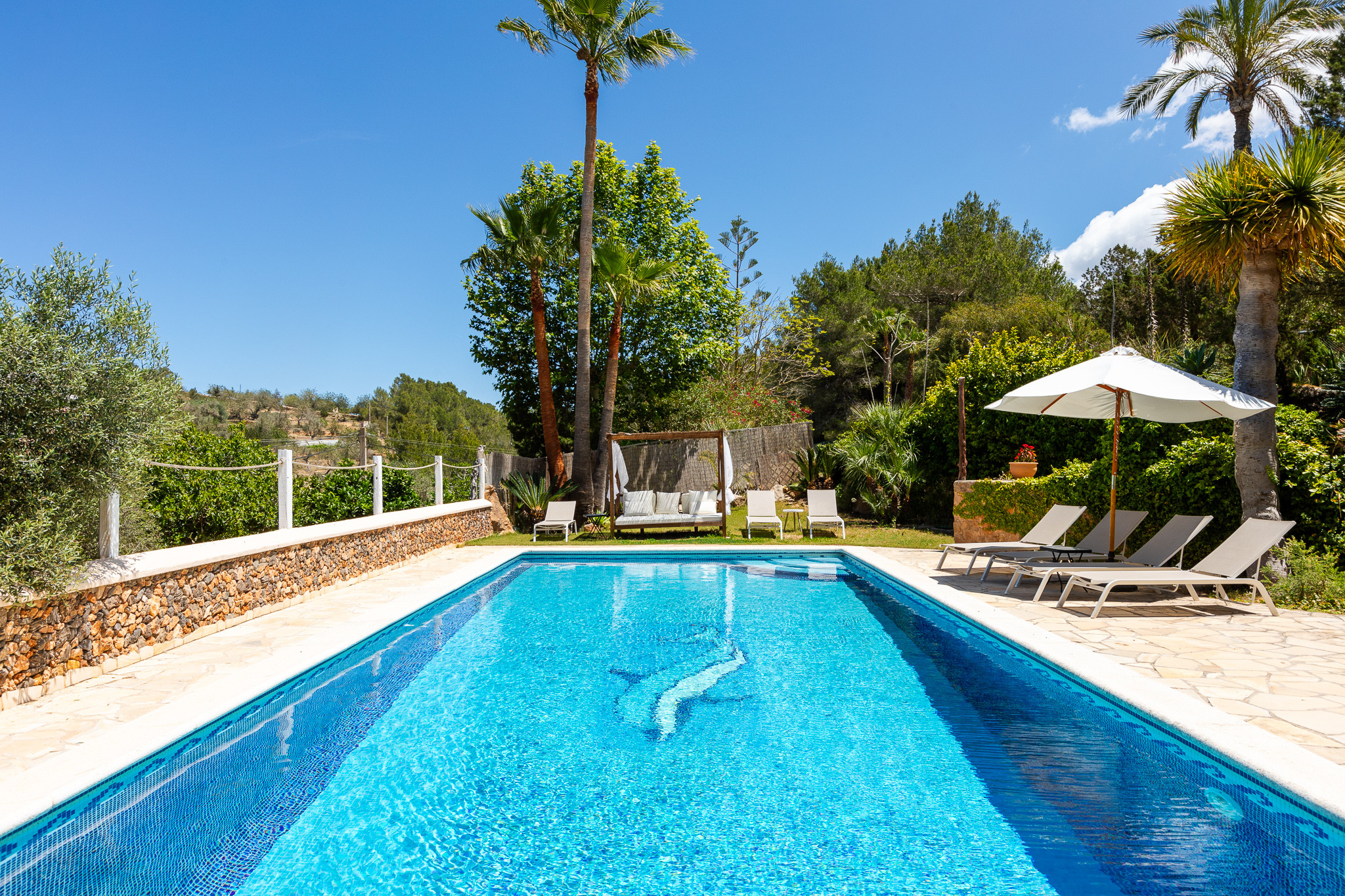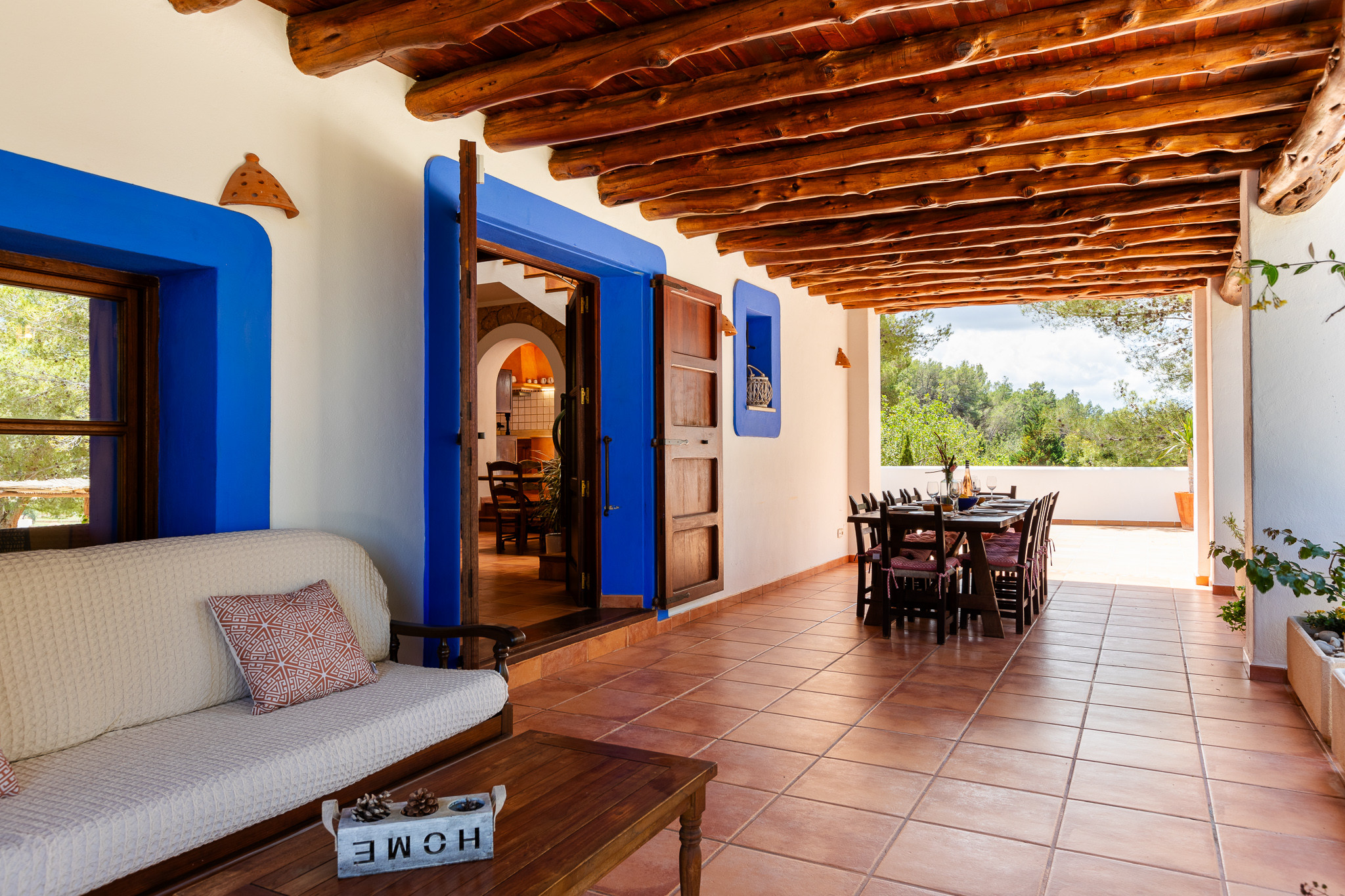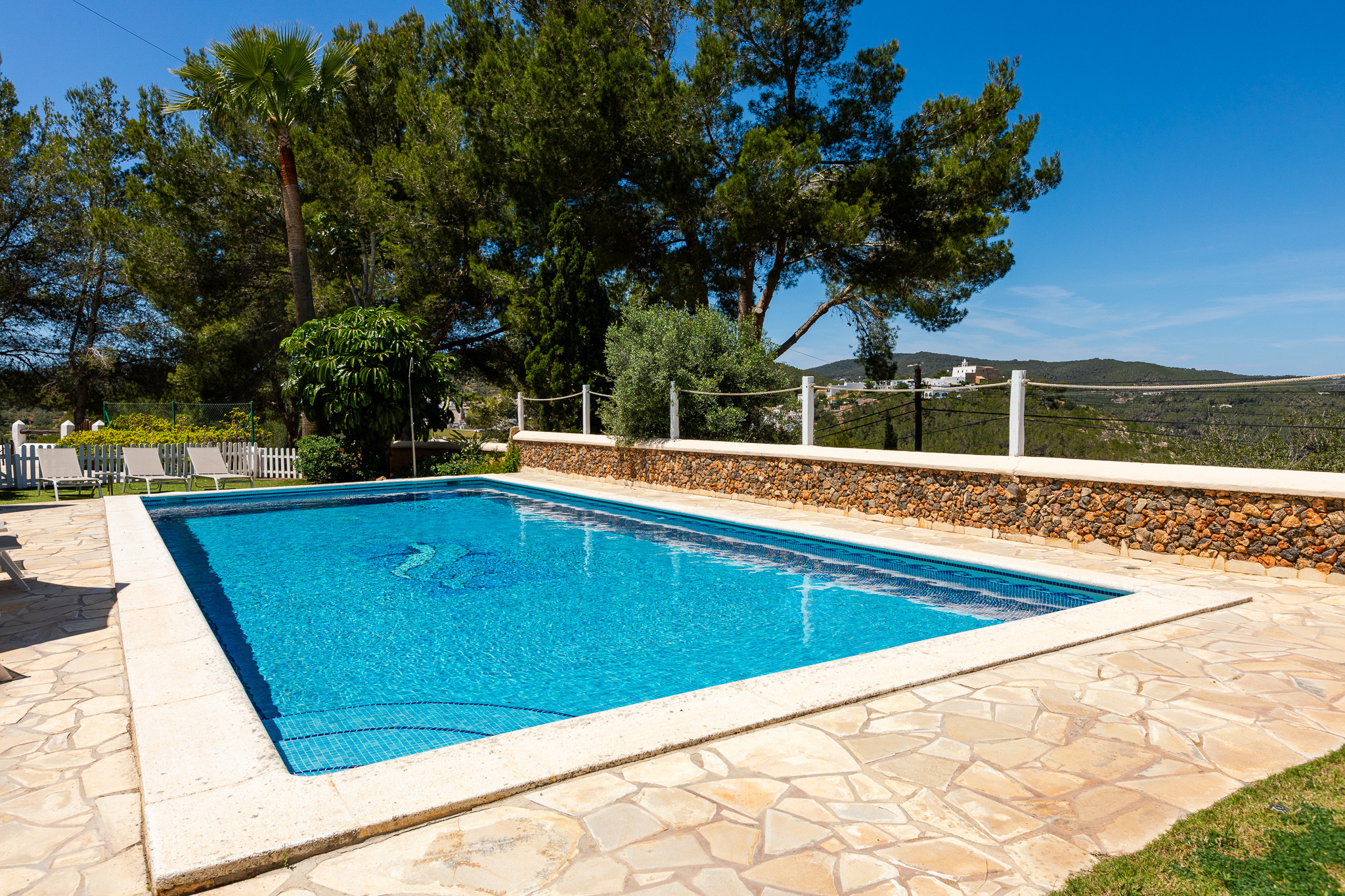 Buiten is er een overdekt terras met savina balken, een grote eettafel en een pingpongtafel. Beneden aan de trap bevinden zich de barbecue en het zwembad van 11 x 5m met een Balinees bed en ligbedden. Vanuit de zwemzone kan men de kerk van San Miguel en de zee op de achtergrond bekijken, en bovendien genieten van prachtige zonsondergangen tussen de bergen.