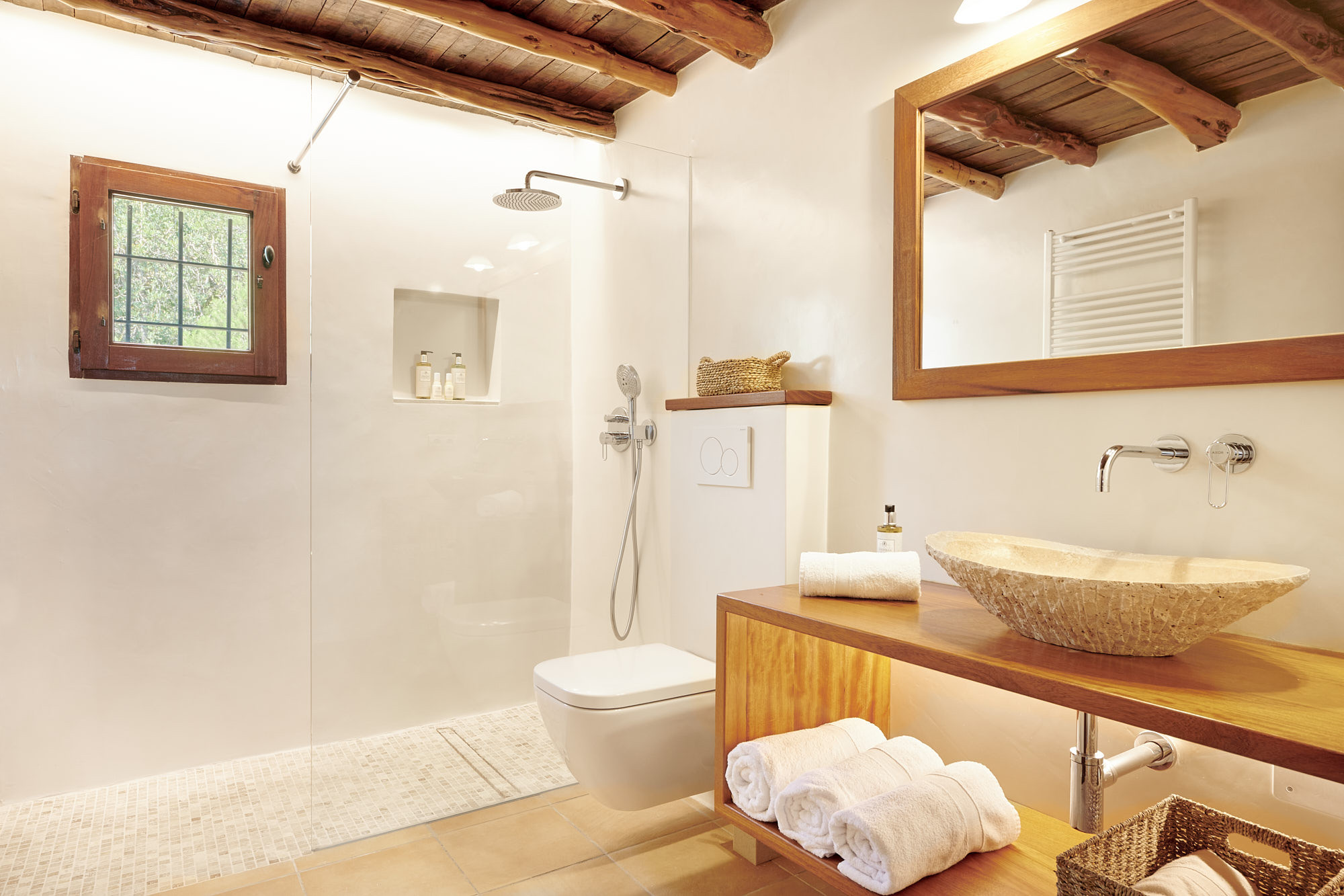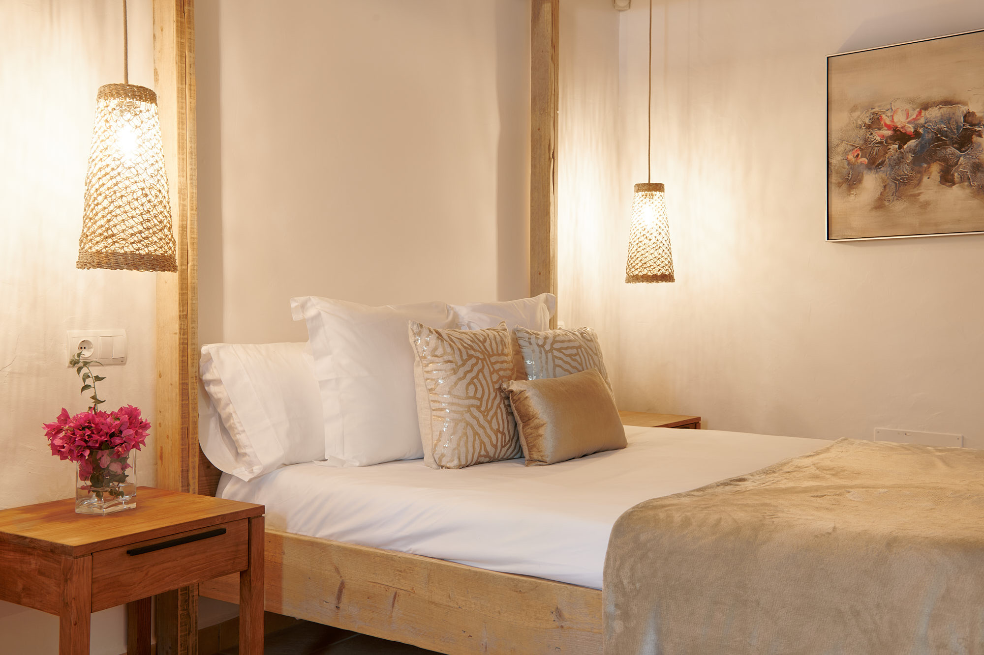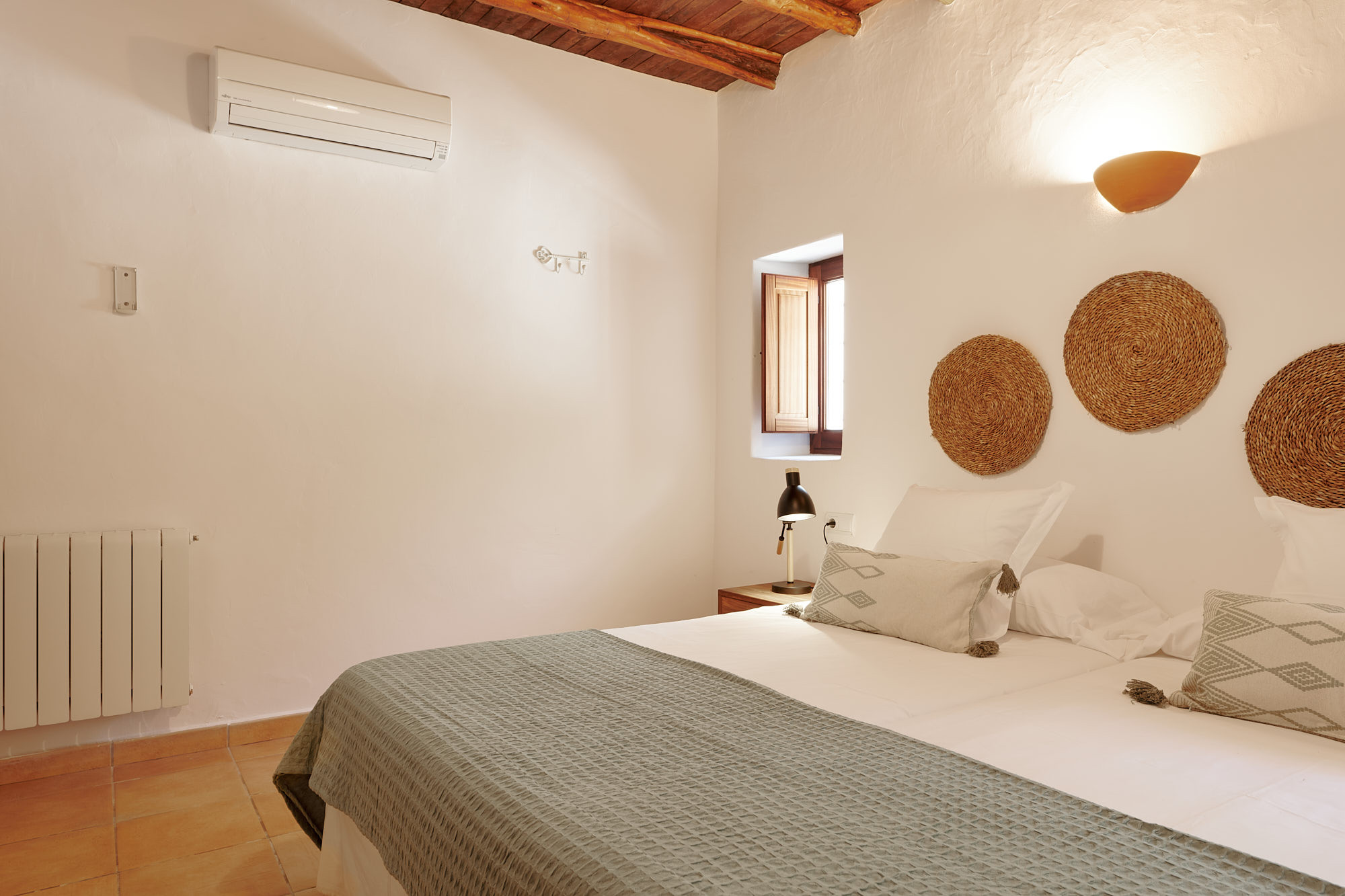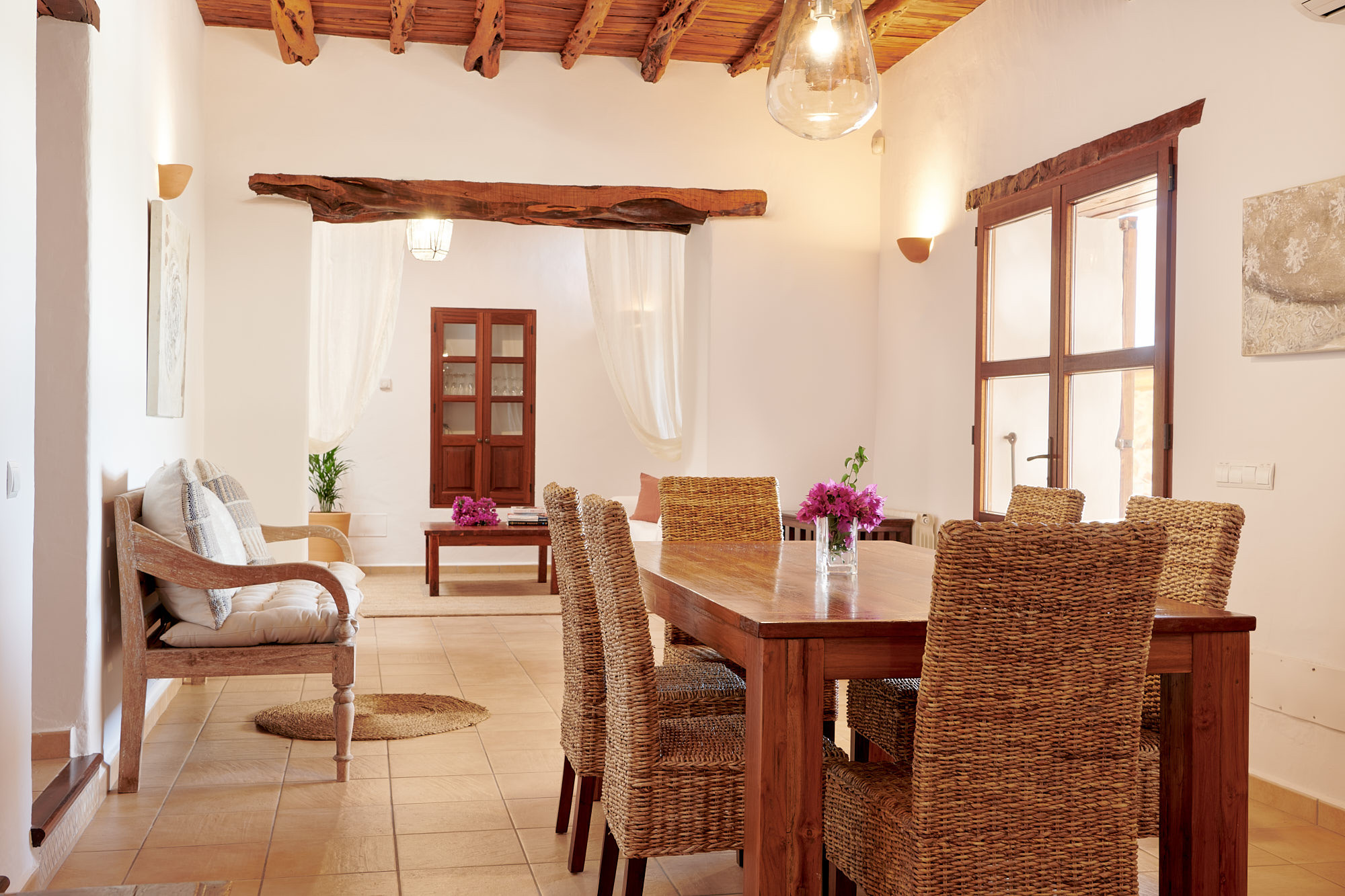 Prachtige boerderij in traditionele Ibizaanse stijl van 350m2, zeer goed onderhouden en met smaak ingericht. Het beschikt over een totaal van 5 slaapkamers en capaciteit voor 9 gasten. Het bevindt zich in een rustige vallei, tussen de dorpen Santa Gertrudis en Santa Eulalia, omgeven door velden en dennenbossen.