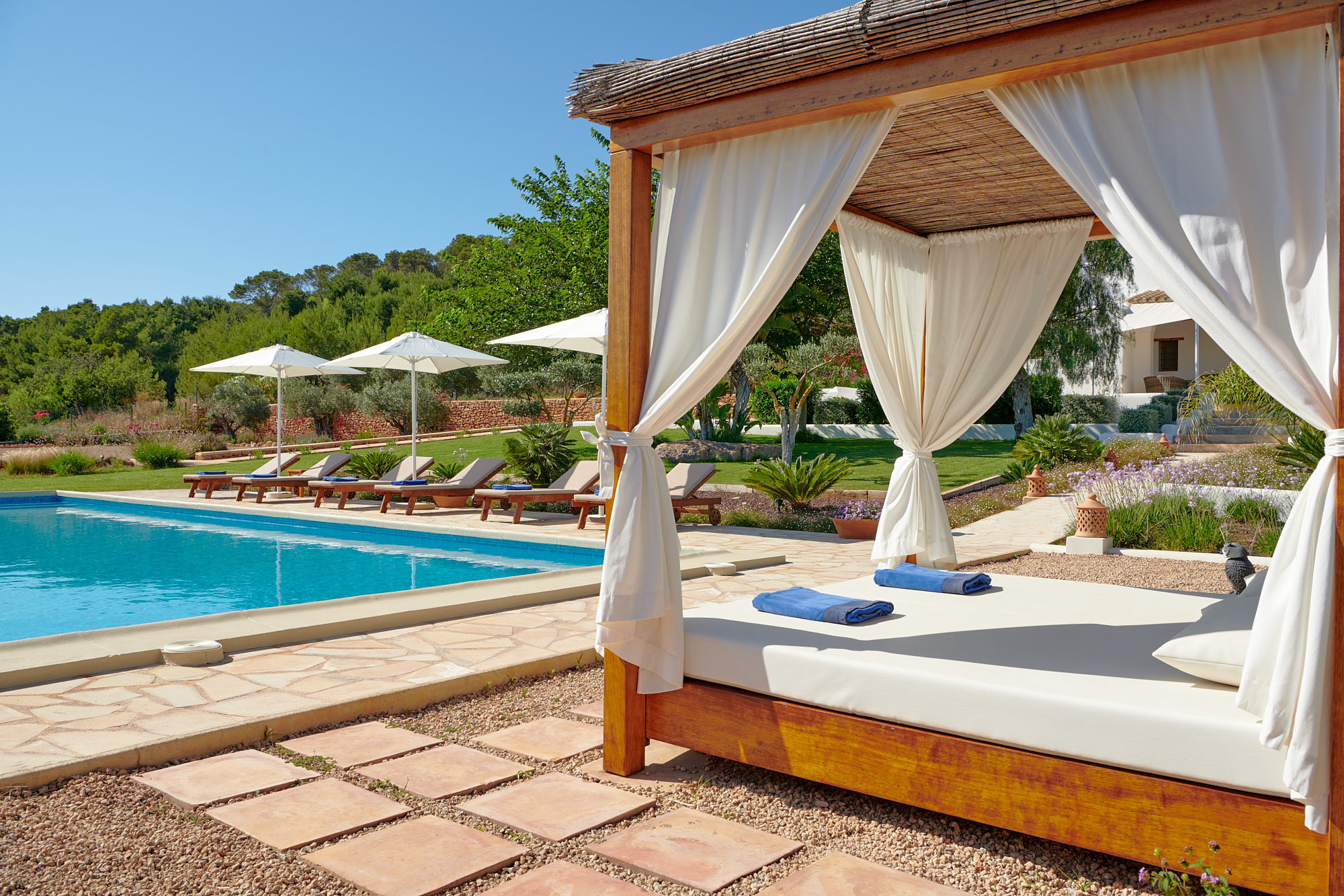 De buitenzone beschikt over een indrukwekkende tuin met diverse planten en fruitbomen, een buiteneetruimte onder een veranda, een gasbarbecue, een groot zwembad met zout water, een Balinees bed, ligbedden en parasols.
