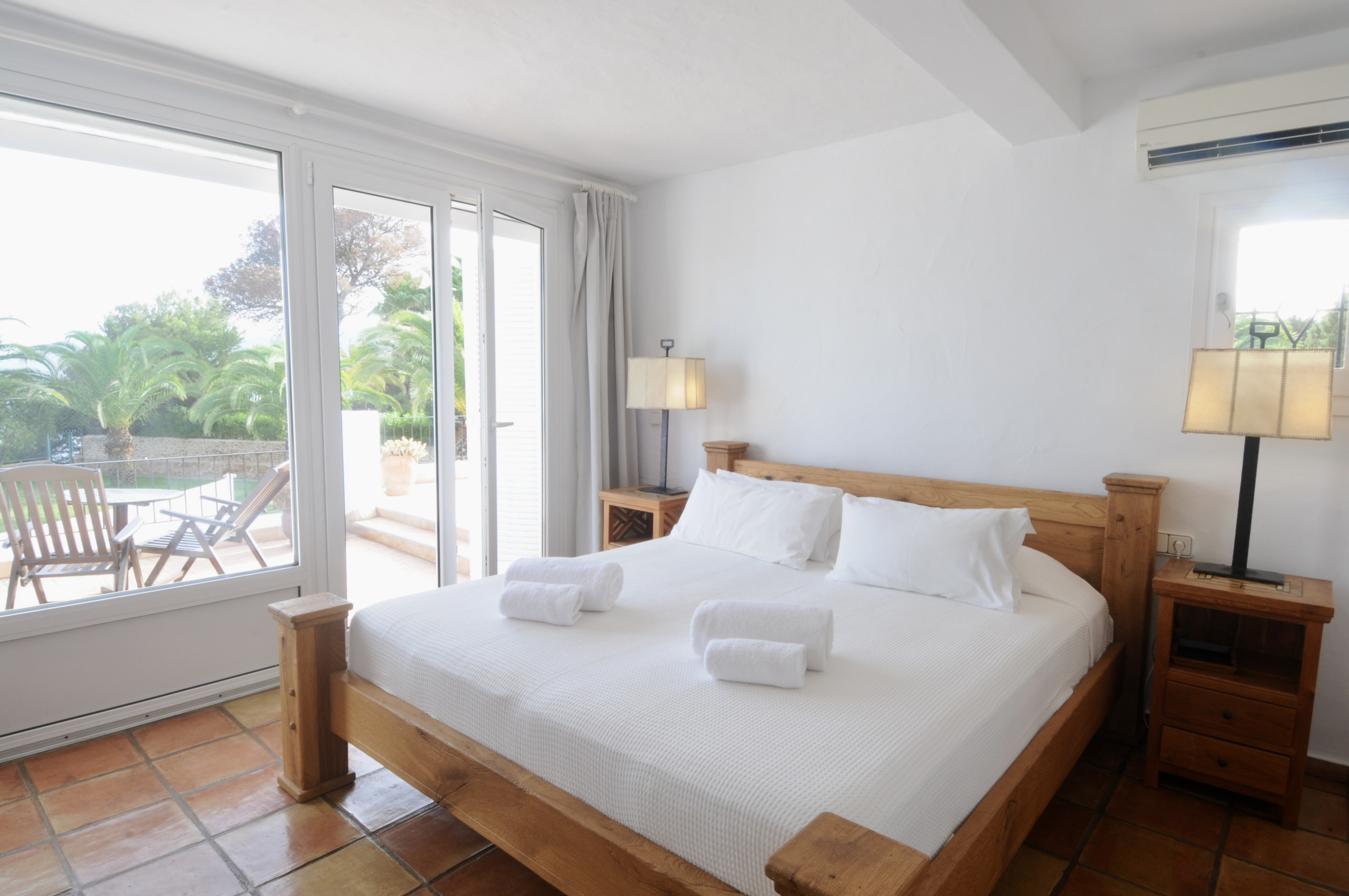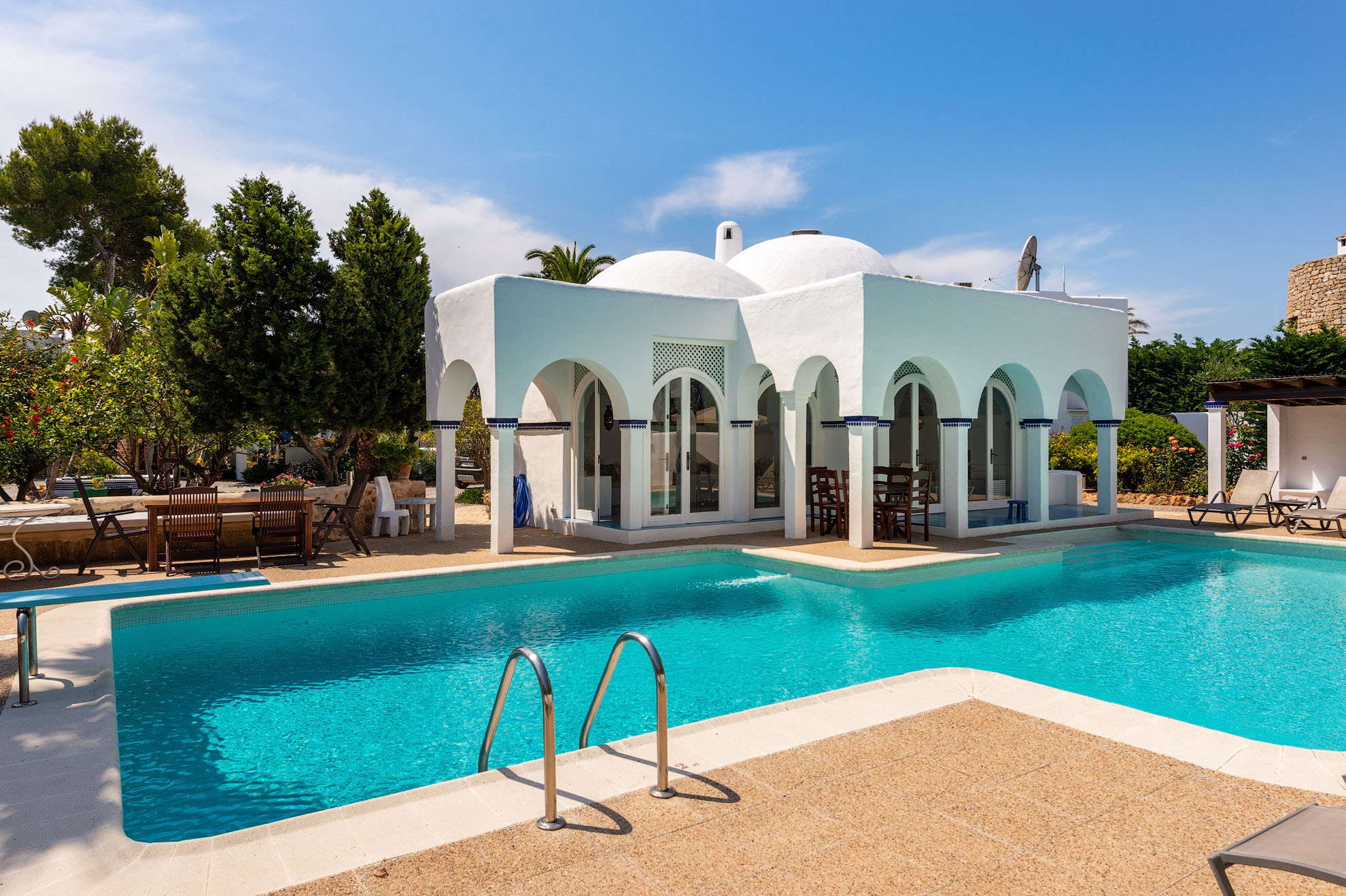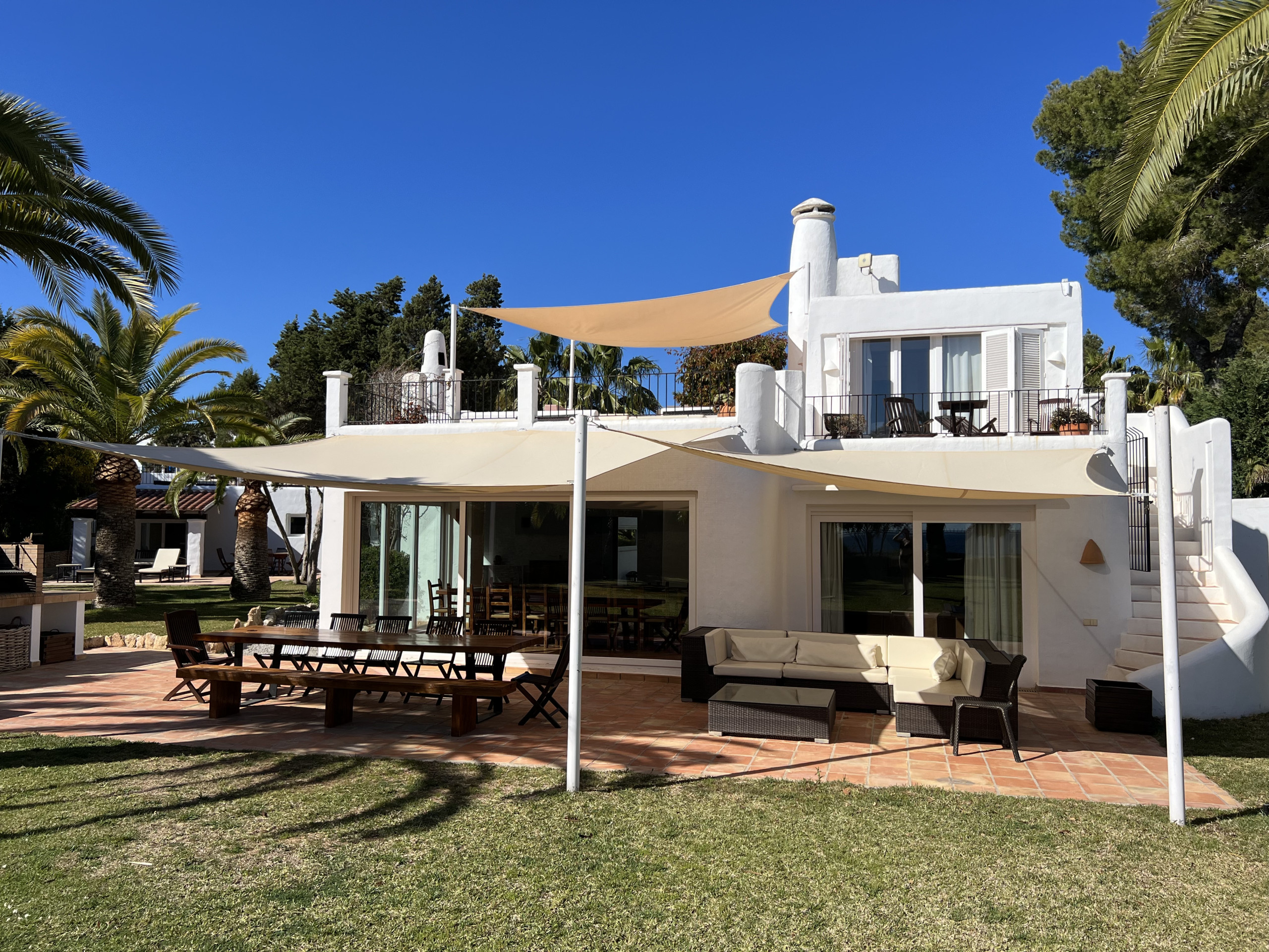 De typische Ibizaanse architectuur combineert zich met Marokkaanse elementen, waardoor het een werkelijk betoverend eigendom wordt. Het beschikt over 8 slaapkamers met een eigen badkamer met douche, verdeeld als volgt: 5 slaapkamers in het hoofdhuis en 3 slaapkamers in de onafhankelijke aanbouw. De aanbouw waar drie van de slaapkamers zich bevinden, heeft een keuken, tv en een buitenterras. Alle slaapkamers en woonkamers zijn voorzien van airconditioning. De ruime buitenruimte omvat verschillende terrassen op 2 niveaus, een groot zwembad met duikplank, barbecue, een vijver met vissen en verschillende chill-out zones waar gasten zich volledig kunnen ontspannen. Er is ook een Balinese bedstee om beschermd te zijn tegen de middagzon of om 's avonds een drankje te drinken.