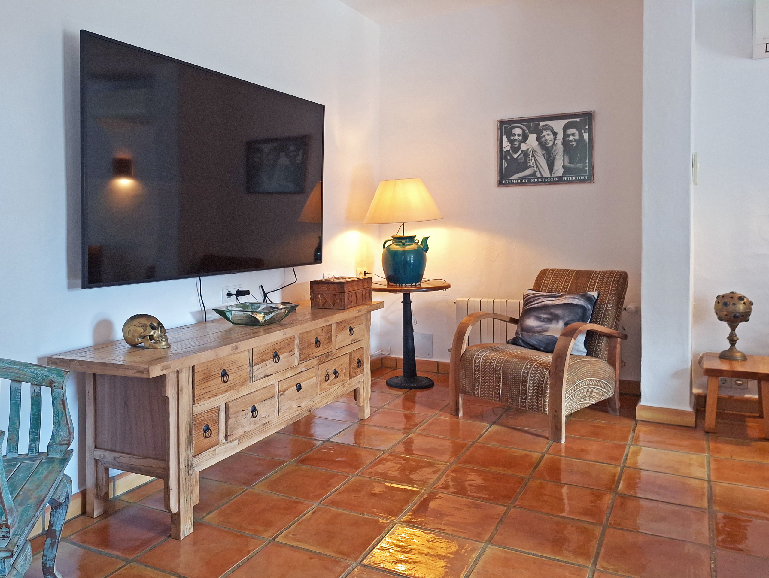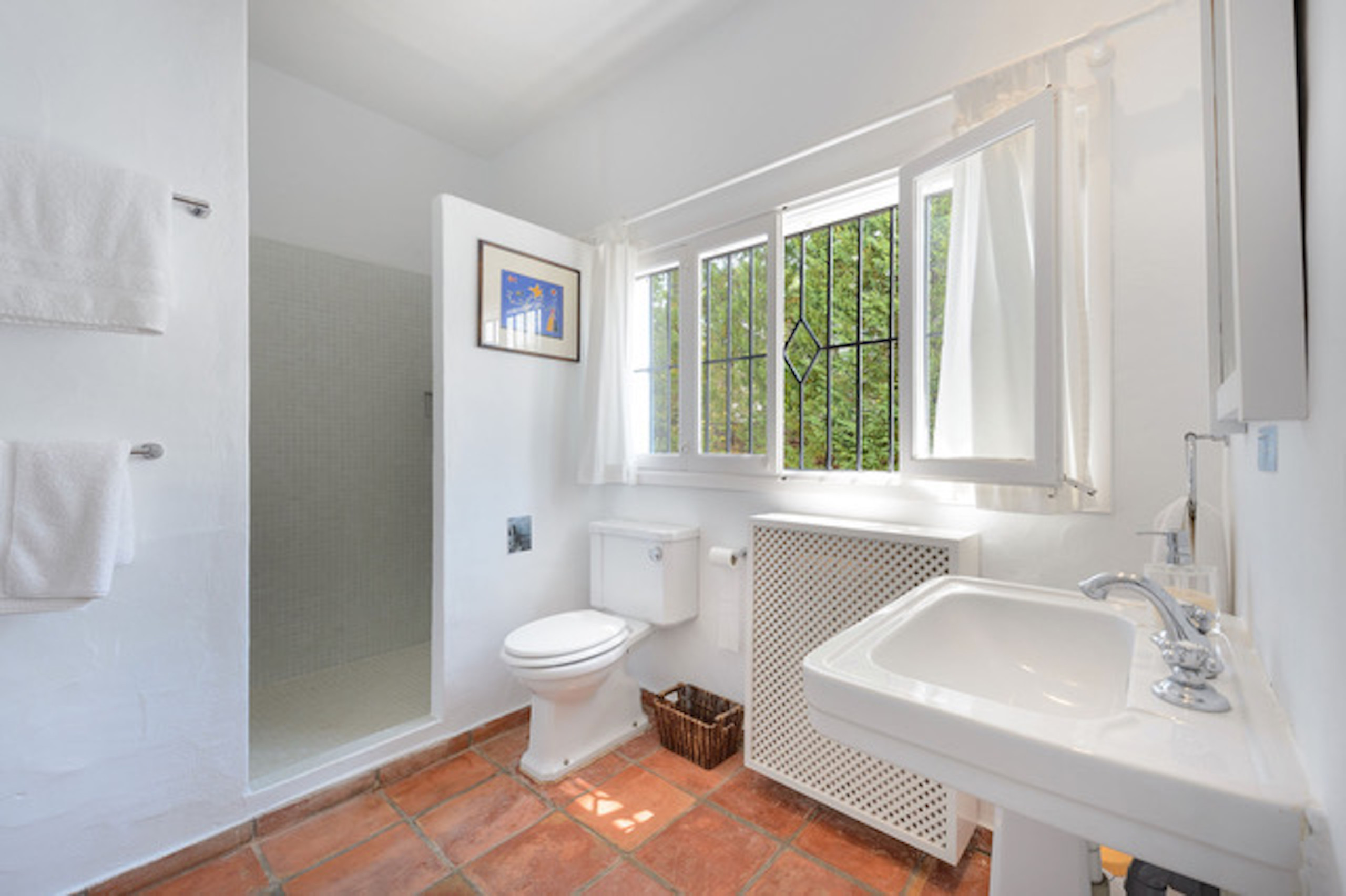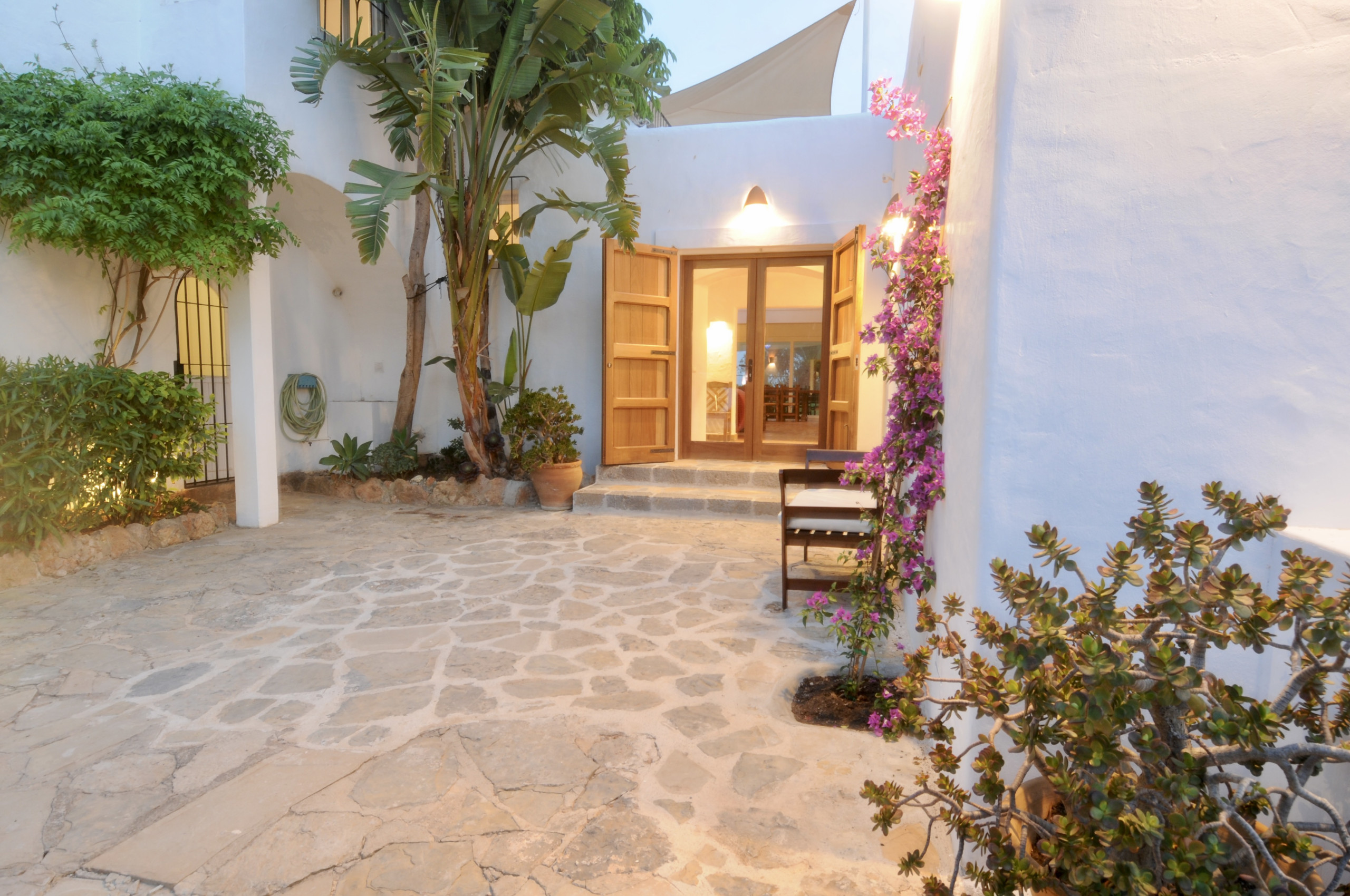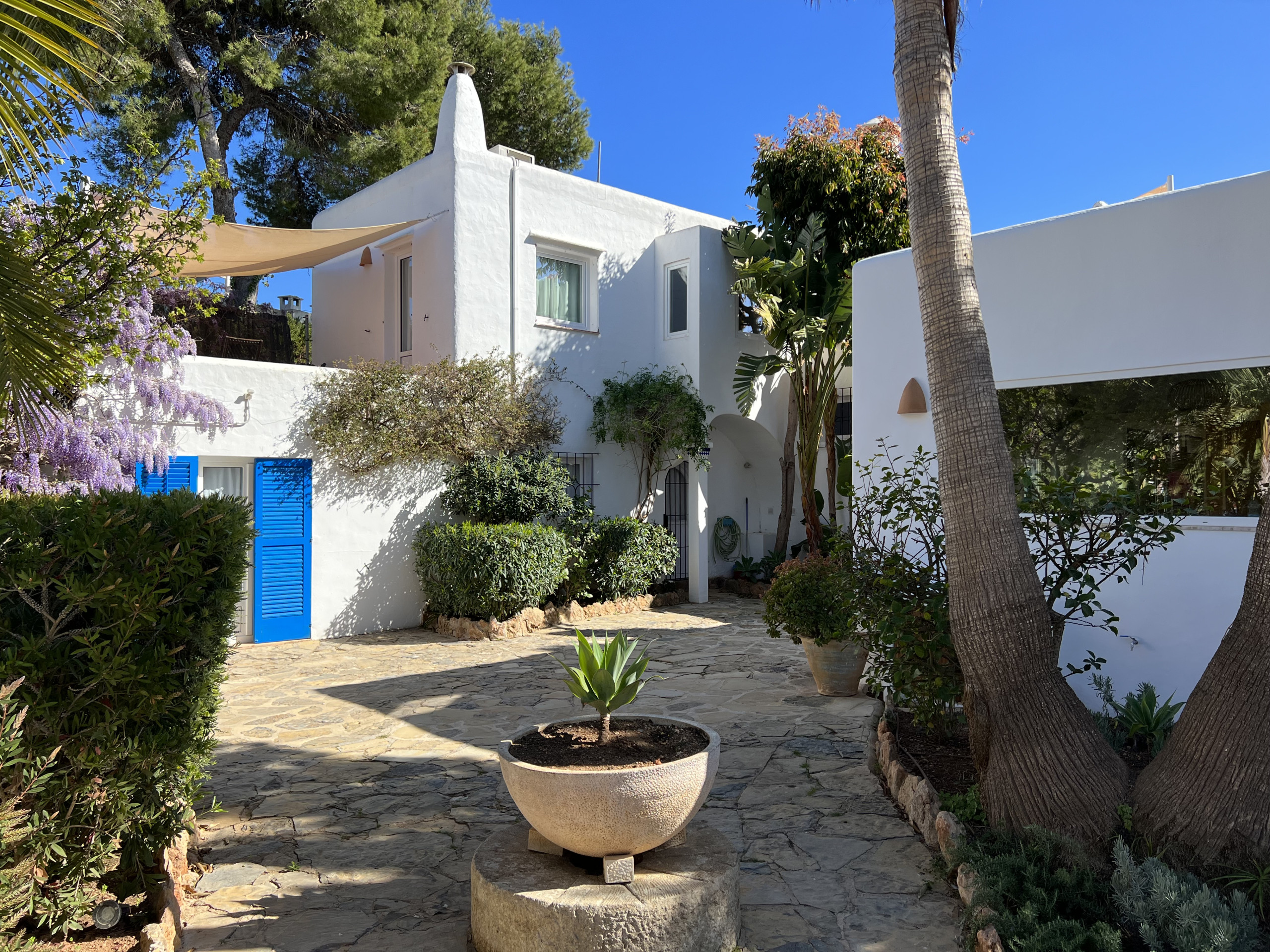 De typische Ibizaanse architectuur combineert zich met Marokkaanse elementen, waardoor het een werkelijk betoverend eigendom wordt. Het beschikt over 8 slaapkamers met een eigen badkamer met douche, verdeeld als volgt: 5 slaapkamers in het hoofdhuis en 3 slaapkamers in de onafhankelijke aanbouw. De aanbouw waar drie van de slaapkamers zich bevinden, heeft een keuken, tv en een buitenterras. Alle slaapkamers en woonkamers zijn voorzien van airconditioning. De ruime buitenruimte omvat verschillende terrassen op 2 niveaus, een groot zwembad met duikplank, barbecue, een vijver met vissen en verschillende chill-out zones waar gasten zich volledig kunnen ontspannen. Er is ook een Balinese bedstee om beschermd te zijn tegen de middagzon of om 's avonds een drankje te drinken.