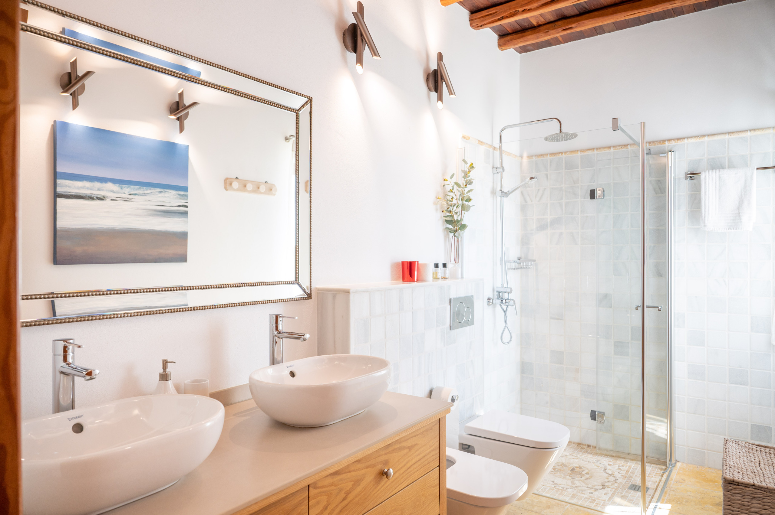 Op de eerste verdieping bevinden zich de andere 3 slaapkamers. De hoofdsuite beschikt over een bed van 180x200 cm, airconditioning, een grote badkamer met een whirlpoolbad en een aparte douche, en toegang tot het terras om te genieten van het adembenemende uitzicht op zee. De derde slaapkamer heeft een bed van 160x200 cm, een aparte douche met whirlpool, airconditioning en toegang tot het terras. De vierde kamer beschikt over een bed van 160x200 cm, een badkamer met whirlpoolbad, airconditioning en een terras met spectaculair uitzicht. Vanuit alle kamers heeft men een onbelemmerd uitzicht op zee; elke slaapkamer heeft een privétoegang tot terrassen of balkons, wat een constante verbinding met de omgeving geeft.